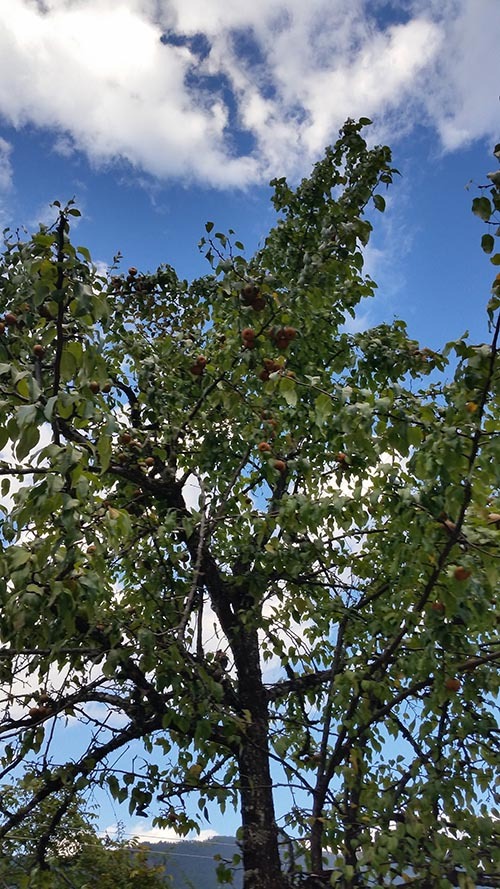 (野梨树,梨子味道不如栽培的那么多汁甜蜜,却也并不难吃,肉质非常紧实饱满,我们把皮削了当午餐。)