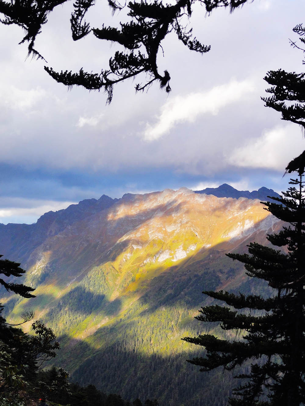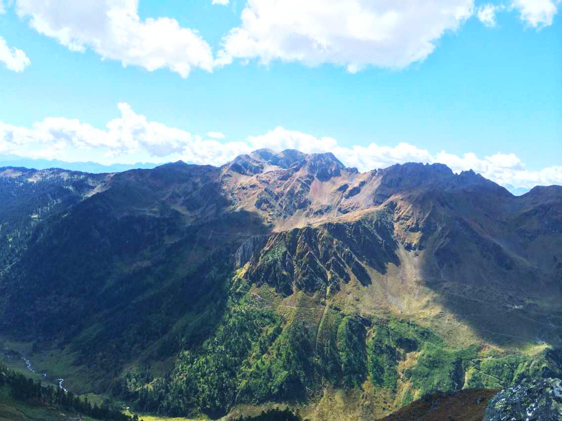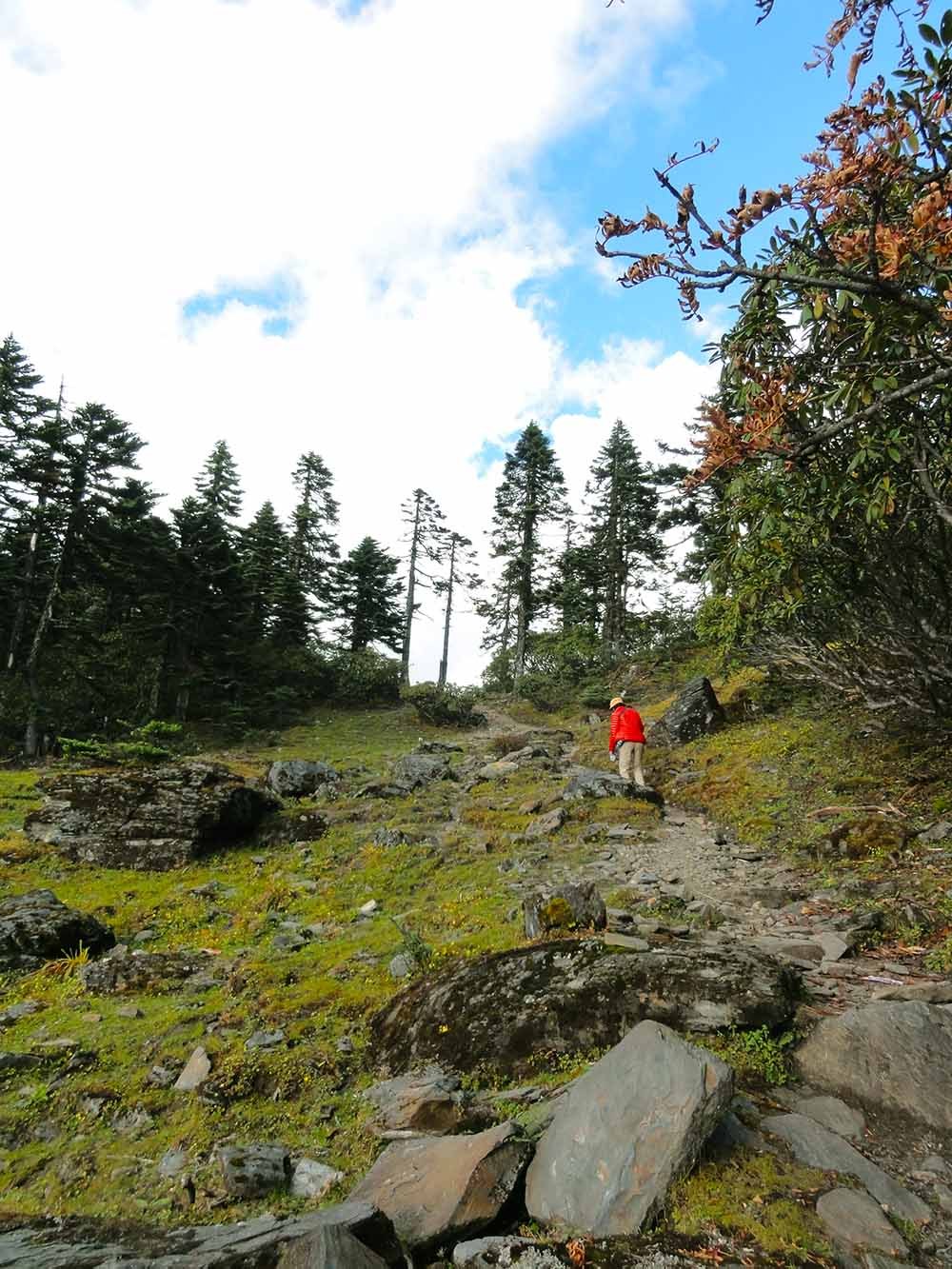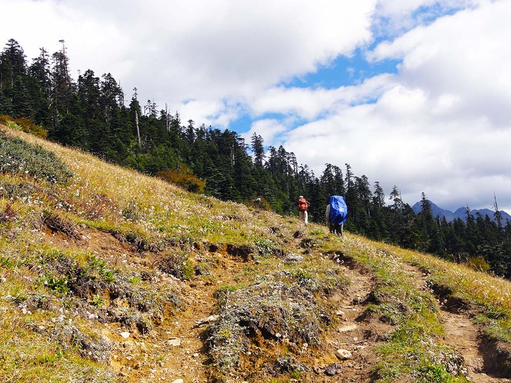 上垭口我们大约用了3个小时,中途碰见了两个外国人,一个来自加拿大的男子和一个来自美国的女子,他们走得很慢,但是很匀速,我们休息的时候,他们也一直在走。而且他们应该没有请马帮,东西全部自己背着,尤其是那个加拿大来的男子,年纪有点大了,看起来挺吃力的。