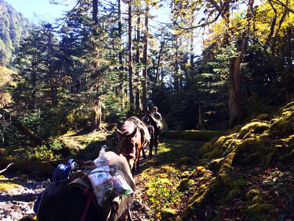 在我们穿越松树林的时候,其中一个队员因为想探路,从另外一个地方横切原始丛林过去了,碰到马帮后我们得知他走的路不太方便,结果把我们急坏了,怕他一会儿绕不回来。