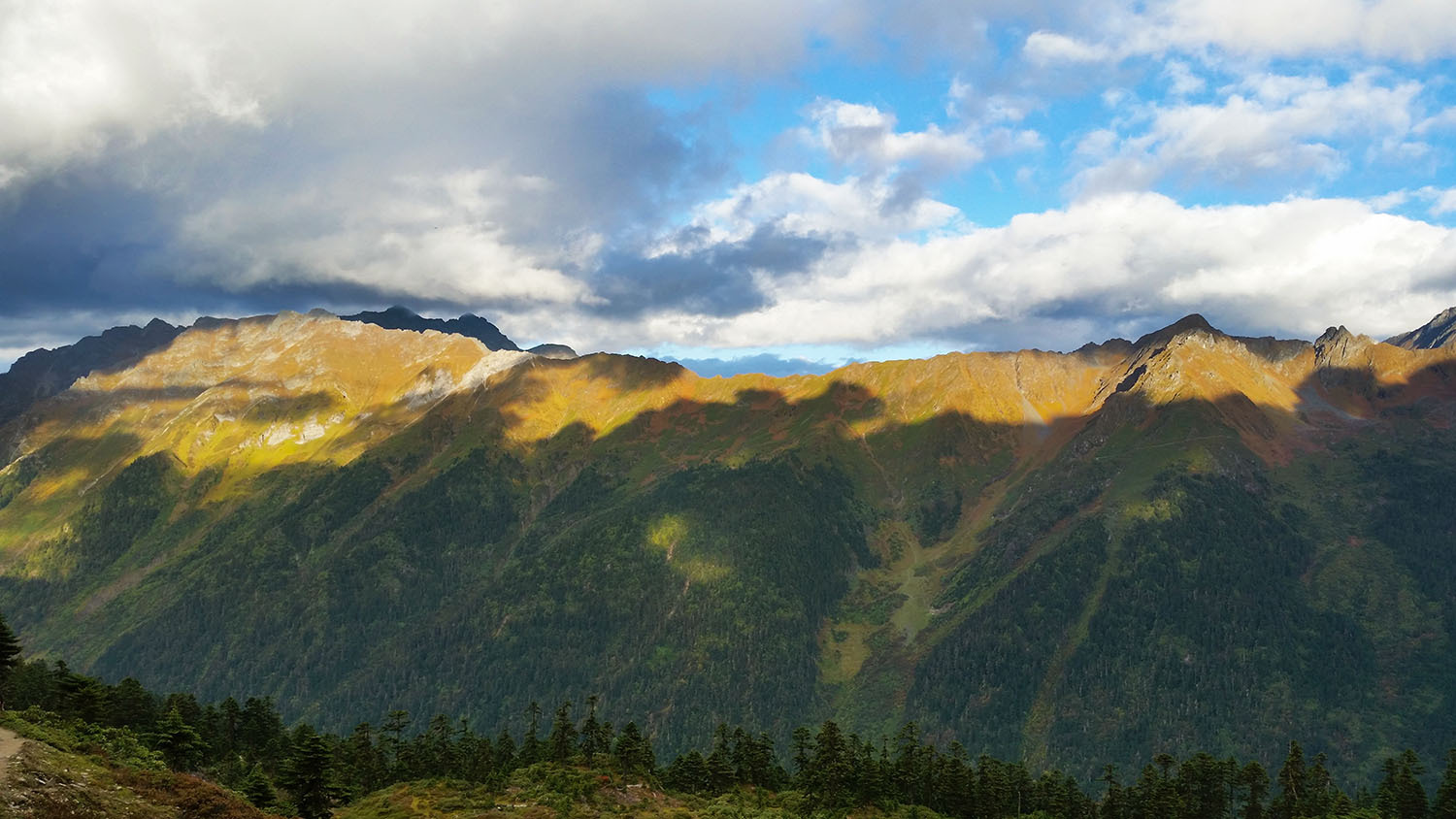 翻越垭口之后,就再也没有上升的路了,连绵的下坡,让一直背着大包的我顿时感到身轻如燕,简直可以飞起来了。 <br> 想起前一天领队的提醒,我们将鞋带扎紧防止顶到脚趾,开始快步下山。 <br> 当我们往山下走的时候,看见了令人震撼的第二次日照金山!
