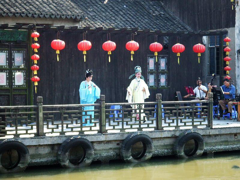 西塘的越剧表演团是由一班退休的越剧爱好者组成的,年纪都已在花甲朝上,每个周末的下午在水上戏台都会有越剧的演出。