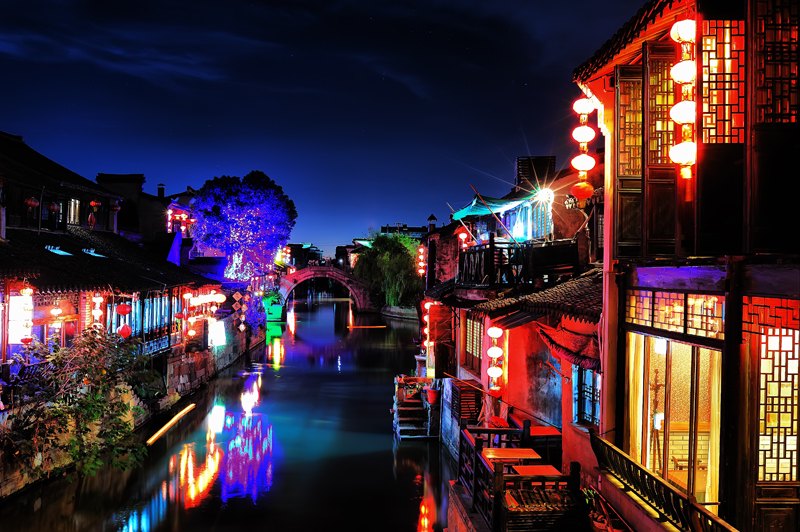 夜幕降临的西塘,沿河长廊下有一排红灯笼,到了晚上彻夜通明,对本地居民来说它们是路灯,对游人来说却是一道亮丽的风景线,柔和的红光把古镇衬得如梦似幻。镇内的永宁桥头,是绝佳的观景点。