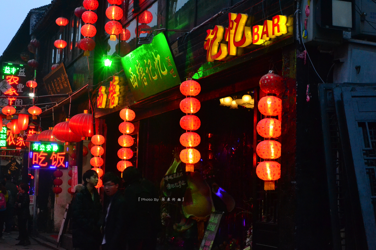 夜晚的西塘酒吧街,灯红酒绿热闹非凡,被誉为“艳遇之地小丽江”,塘东街一带酒吧一间挨着一间,晚上霓虹闪烁,音乐声、歌声此起彼伏。