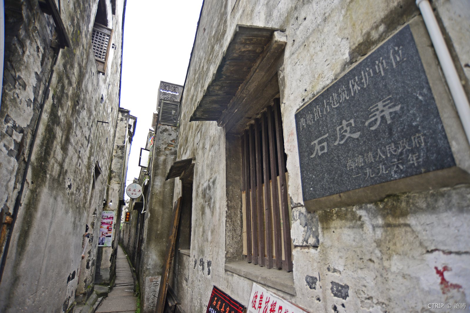 石皮弄是整个古镇最深最窄也是最长的弄堂,在弄堂里望天,苍苍蓝天变成狭长一道,故这里也被称为西塘的“一线天”。石皮弄虽闻名,但因只是一条狭长的弄道,所以游人并不会过多,颇为安静。