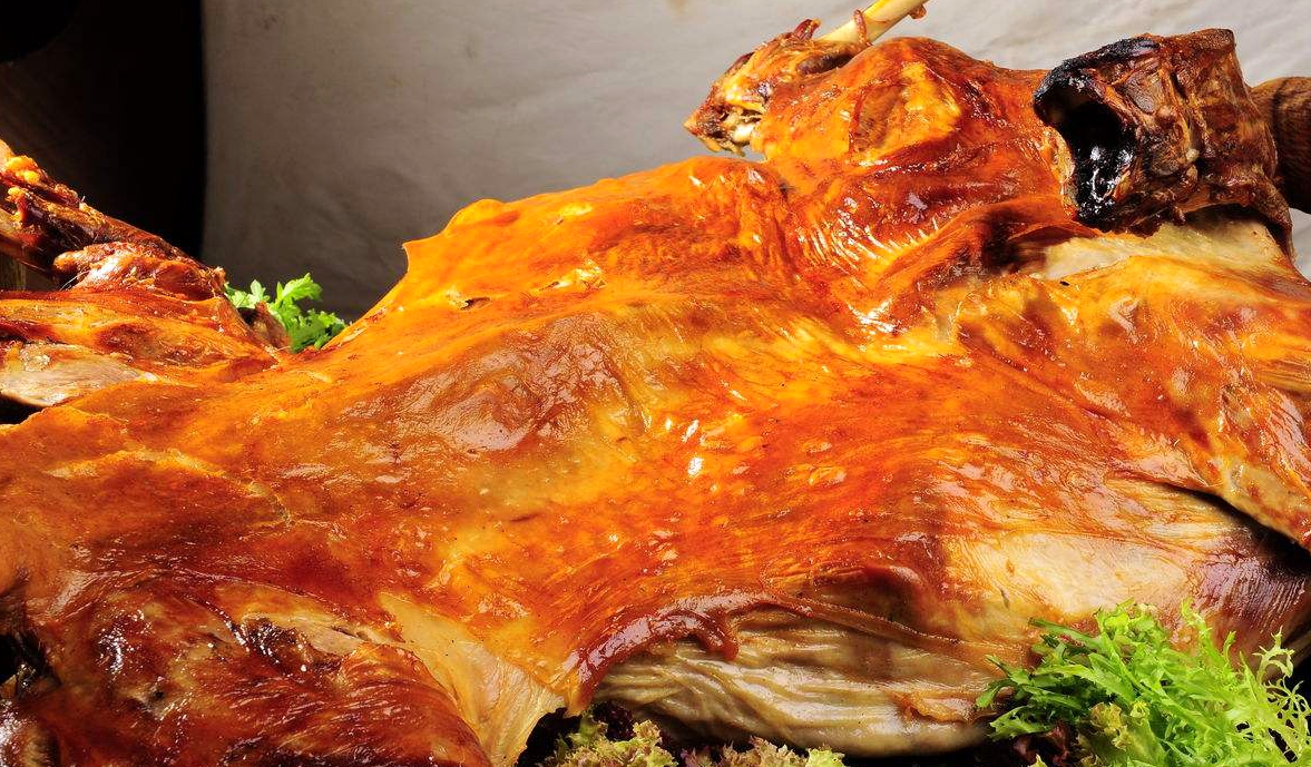 烤全羊外表金黄油亮,外部肉焦黄发脆,内部肉绵软鲜嫩,羊肉味清香扑鼻。