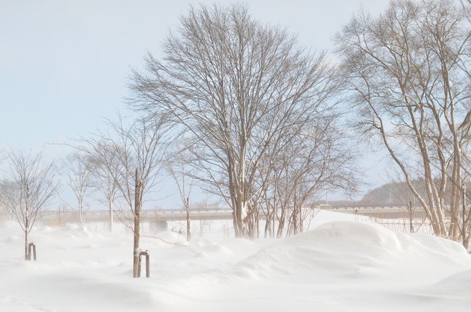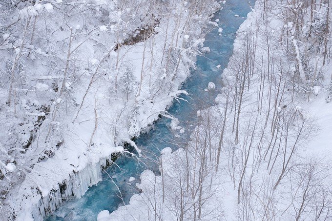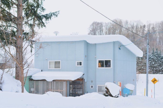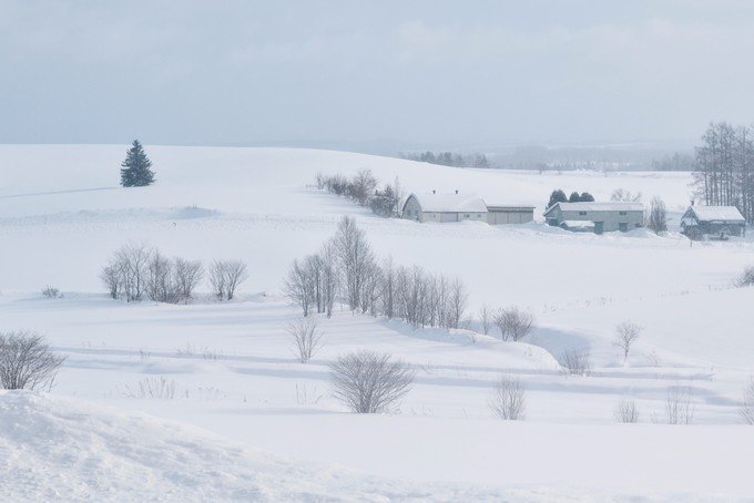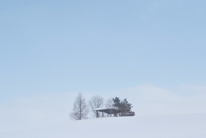 看到这片蓝的时候就到达美瑛了,和我想像的场景是一样的。每棵树每个小房子在白雪的衬托下显得很特别。蓝色的天空,白色的雪,中间一个小小的房子,我想到小时候,学校老师要我们画出心里理想房子的样子,不就是这样的吗?我不知道我看到的这片是不是四季之彩丘,我只知道夏天这里应该是纯绿的一片。