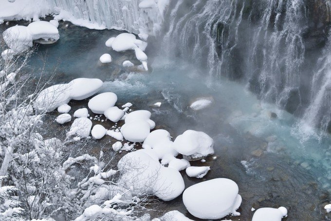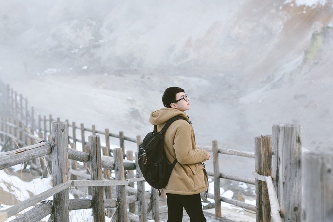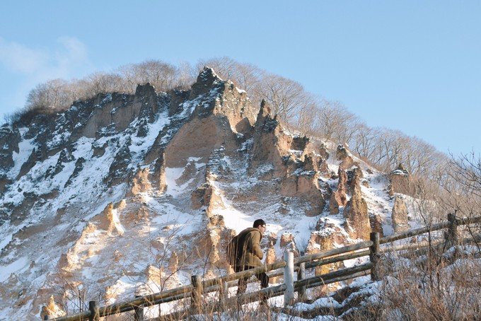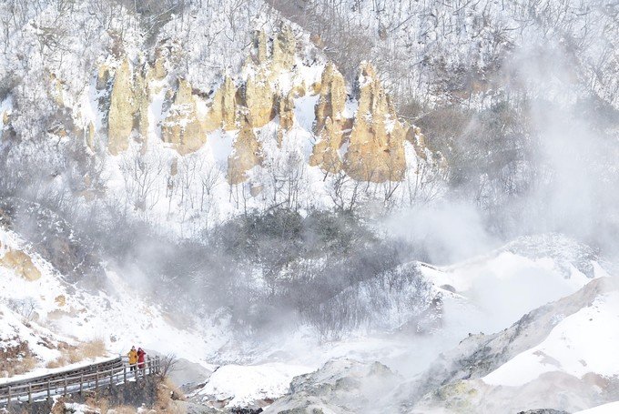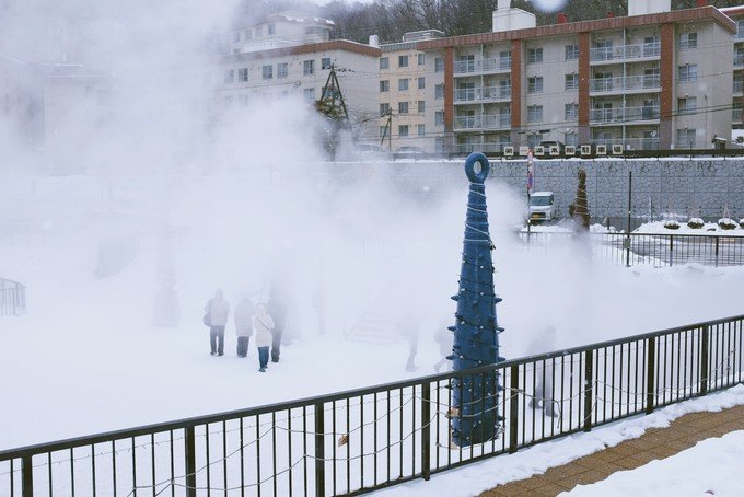 在酒店存完行李,就开始了今天的行程。我咨询了酒店的前台怎么去地狱谷,他说走路过去很近的,给了我一张地图,耐心和我说了附近有哪些值得去的地方。我们从酒店出发一路经过了温泉街,三吉神社和泉源公园,然后到达地狱谷。北海道的天气一会下雪一会出太阳蛮不稳定的。登别可能去的时间有点早,积雪还没有那么多。因为登别温泉是北海道最大的温泉,所以我们也是冲着泡硫磺泉来才来到了登别。
