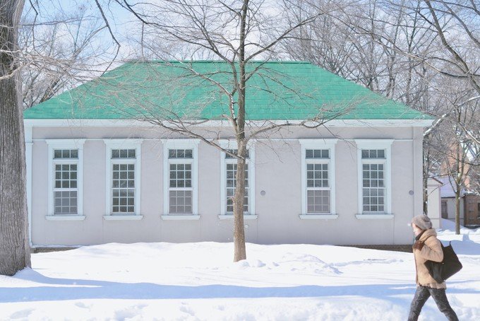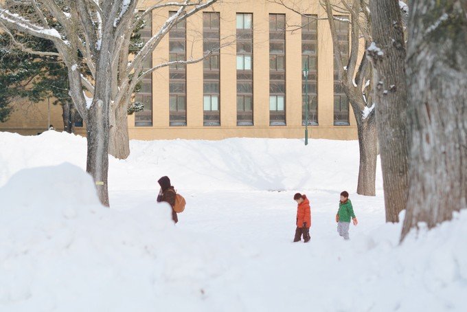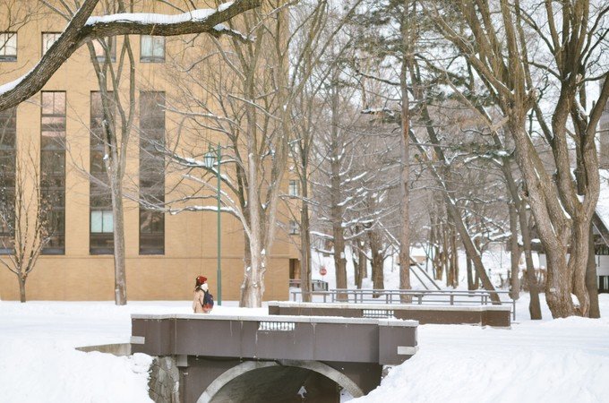 这个时候的大学都被白雪覆盖着,穿过一个小溪流,很多大人和小孩子在这里滑雪,堆雪人。当时的气氛真美好。