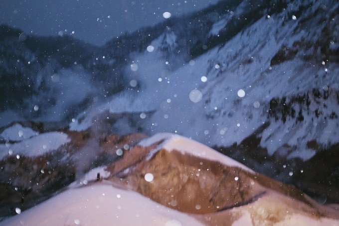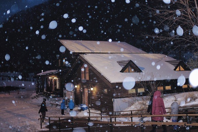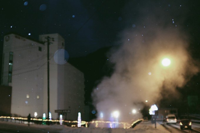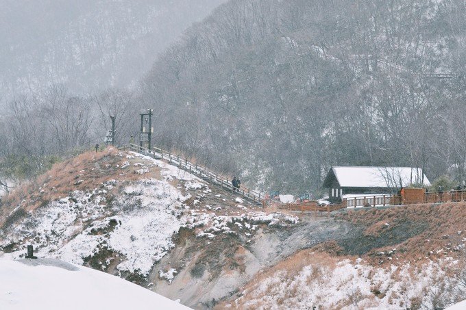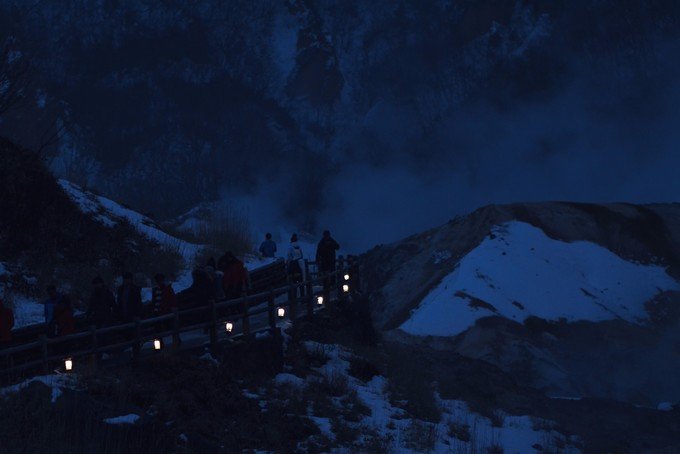 因为天快黑了,旅行团的人渐渐往外走,我们在地狱谷入口小木屋取暖,休息了一会又走进去地狱谷,为了看传说中的鬼火灯路。整个地狱谷不停有乌鸦从头顶飞过,沿着不断冒出白烟的鬼火之路,远远望去,山路弯弯绕绕,灯火忽隐忽现。那时候还飘着雪花,真的好美。幸好在登别呆了一个晚上,才能看到如此景象。