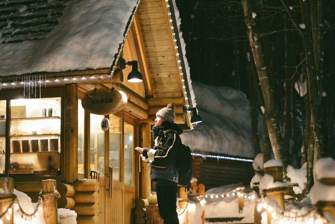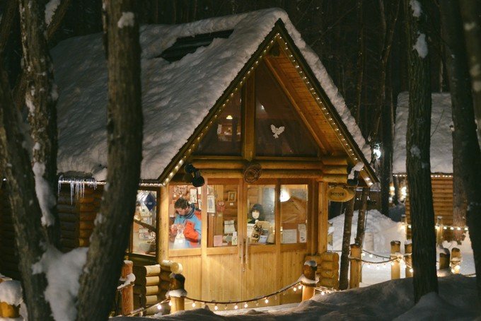 森之时计咖啡馆精灵露台就在新富良野王子酒店旁边的森林里,需要乘巴士前往【新富良野王子酒店】这一站下车,下车后就会看到「優しい時間」几个很美好的字眼。森之时计之所以出名主要因为它是日剧【温柔时光/優しい時間】的拍摄地。夜晚这片小森林都开了灯,特别美好。