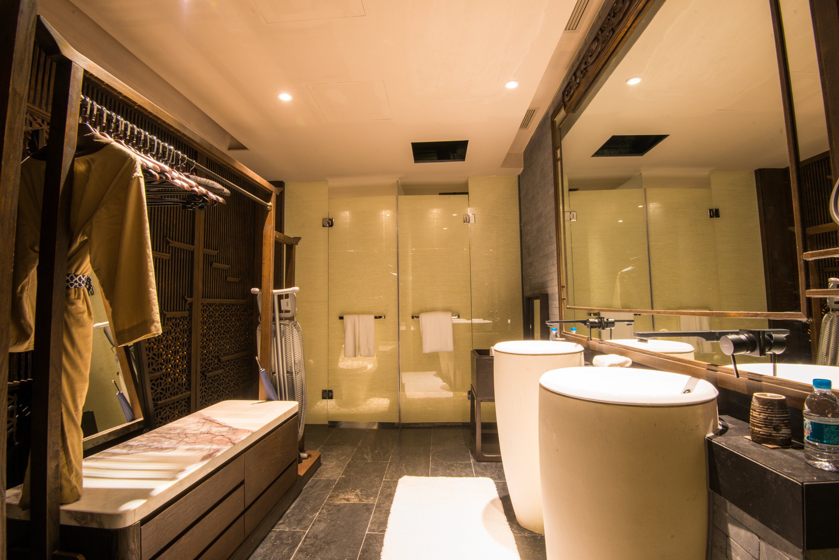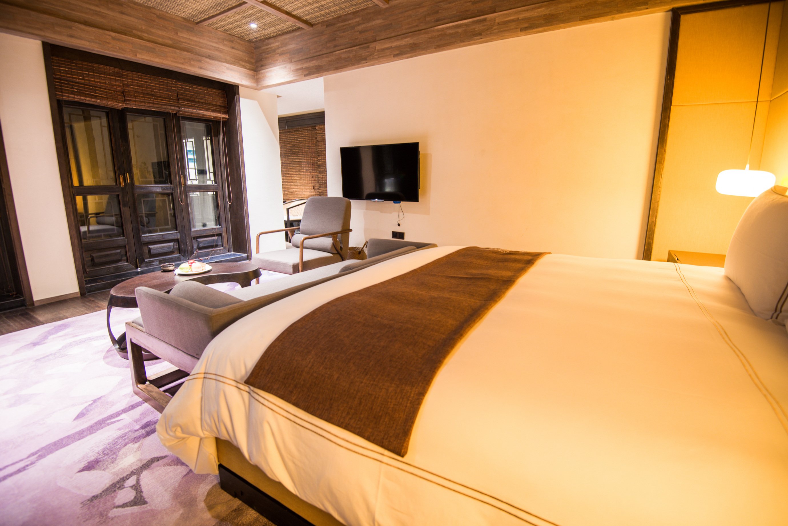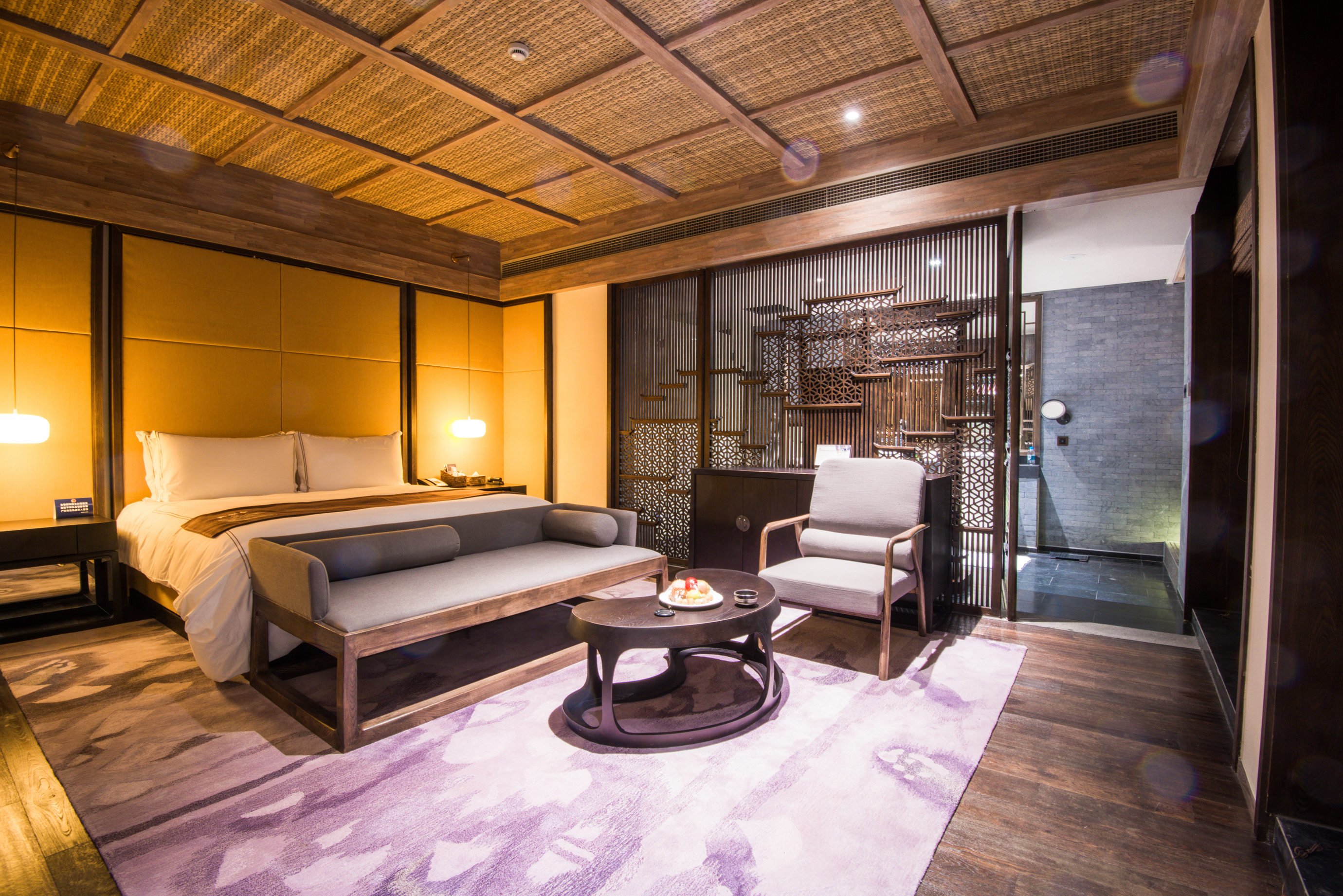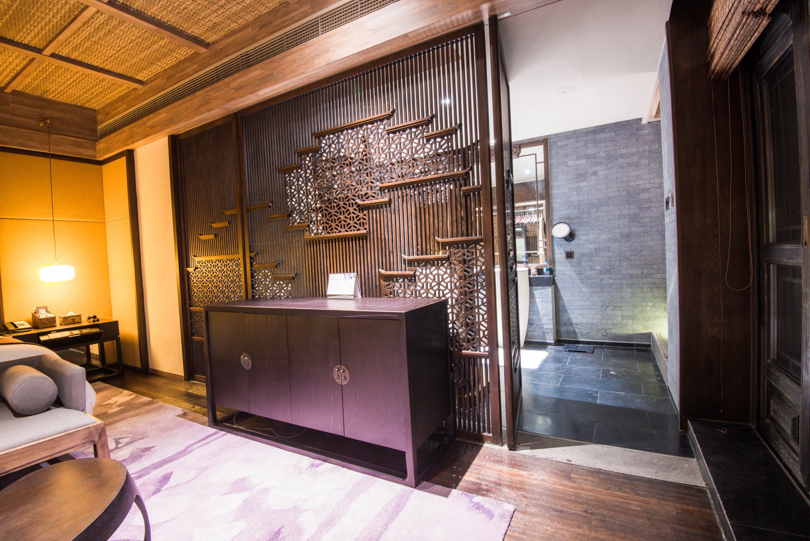 房间的整体面积估摸着有50平左右,而且设计是将现代化都市度假酒店与复古的徽州文化有机结合在一起。