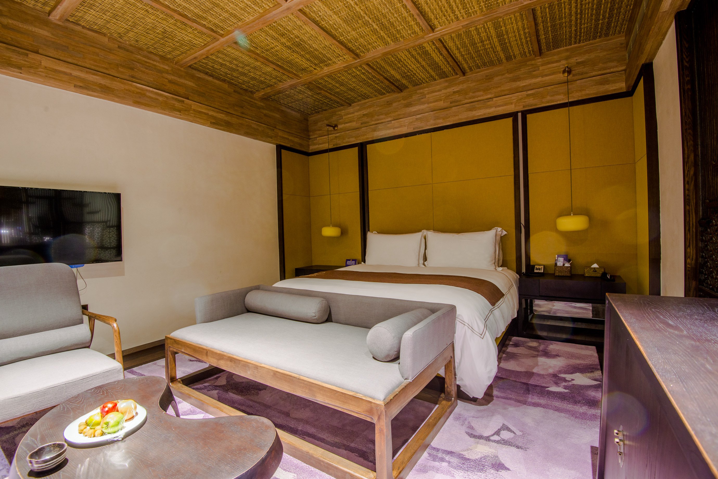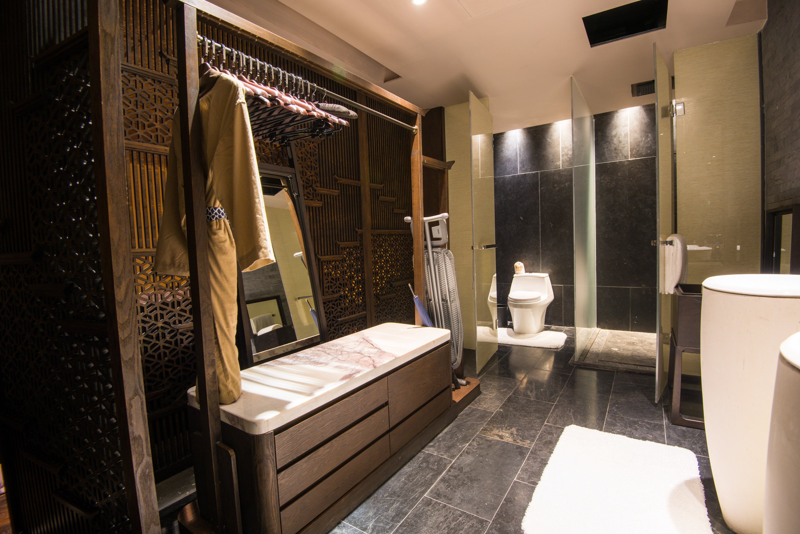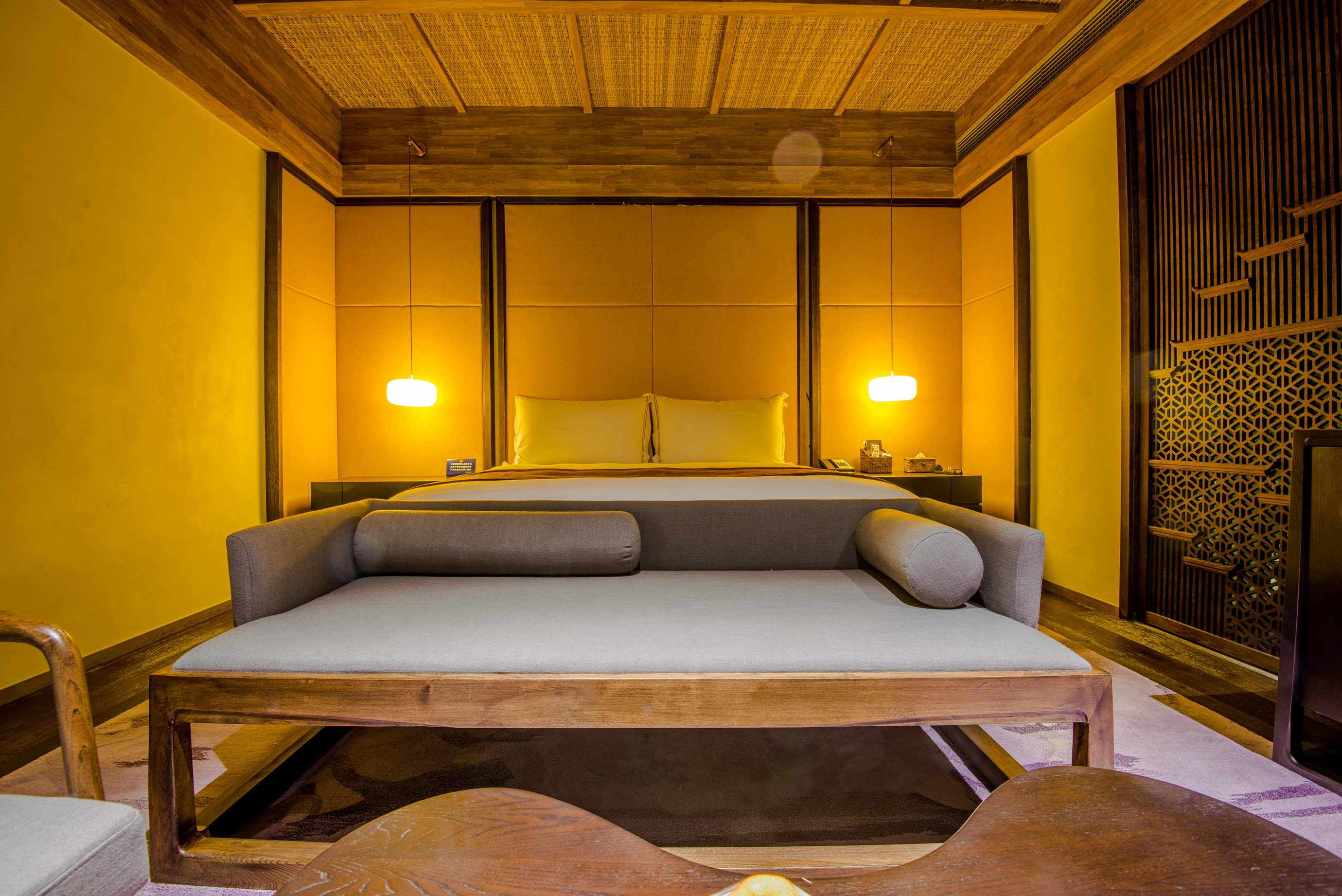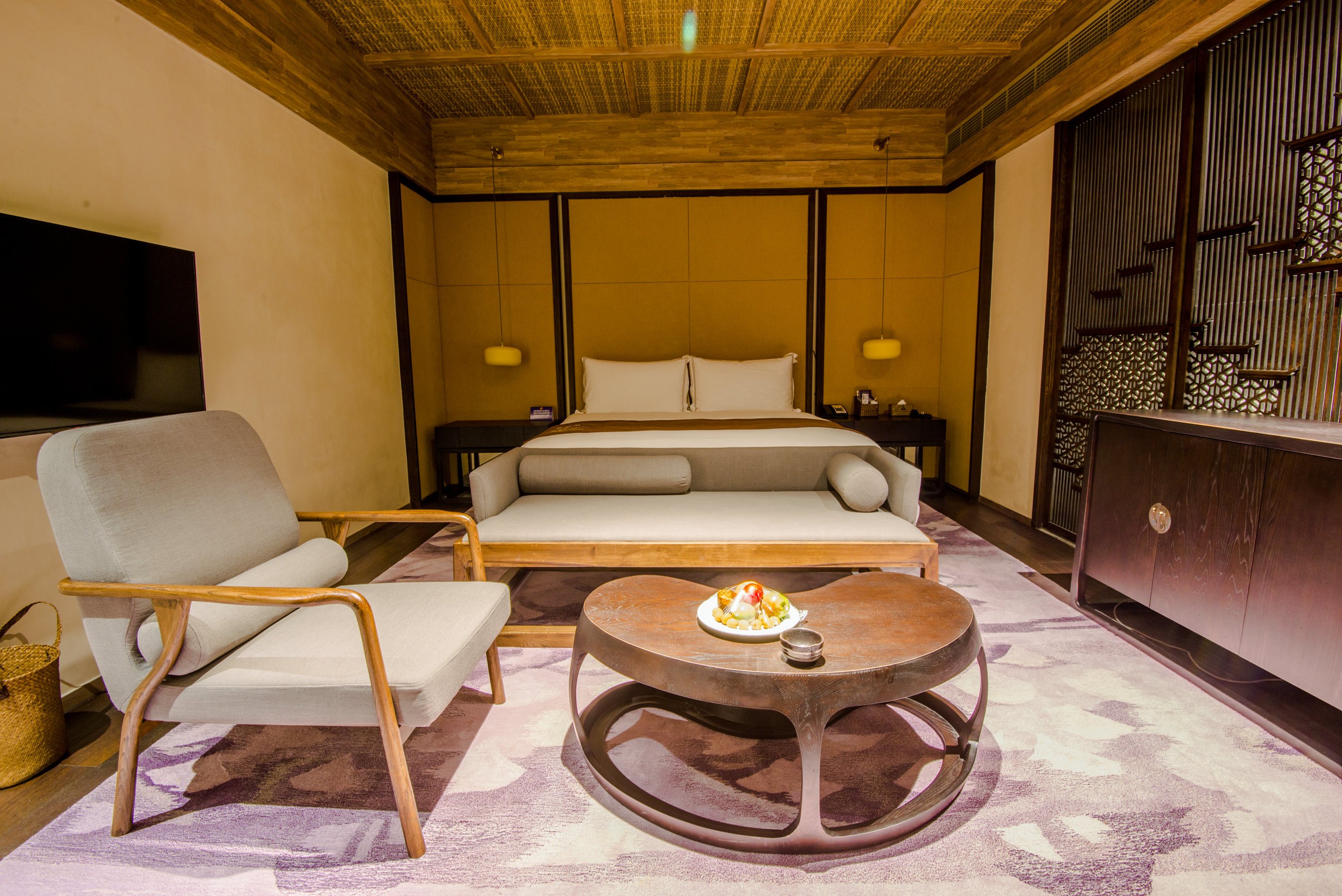 房间的整体面积估摸着有50平左右,而且设计是将现代化都市度假酒店与复古的徽州文化有机结合在一起。