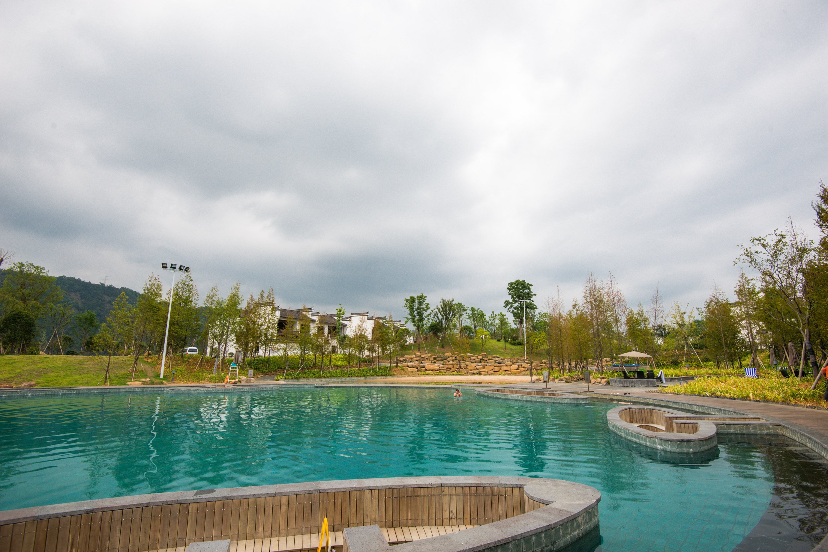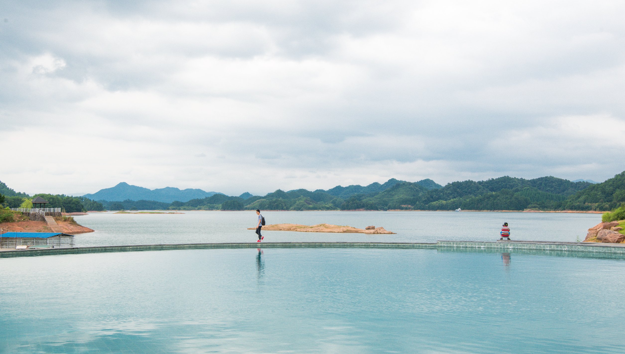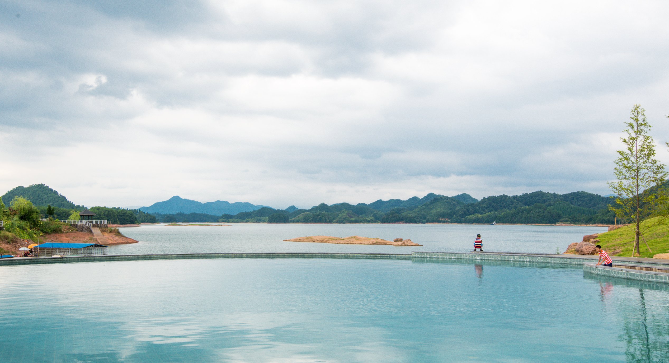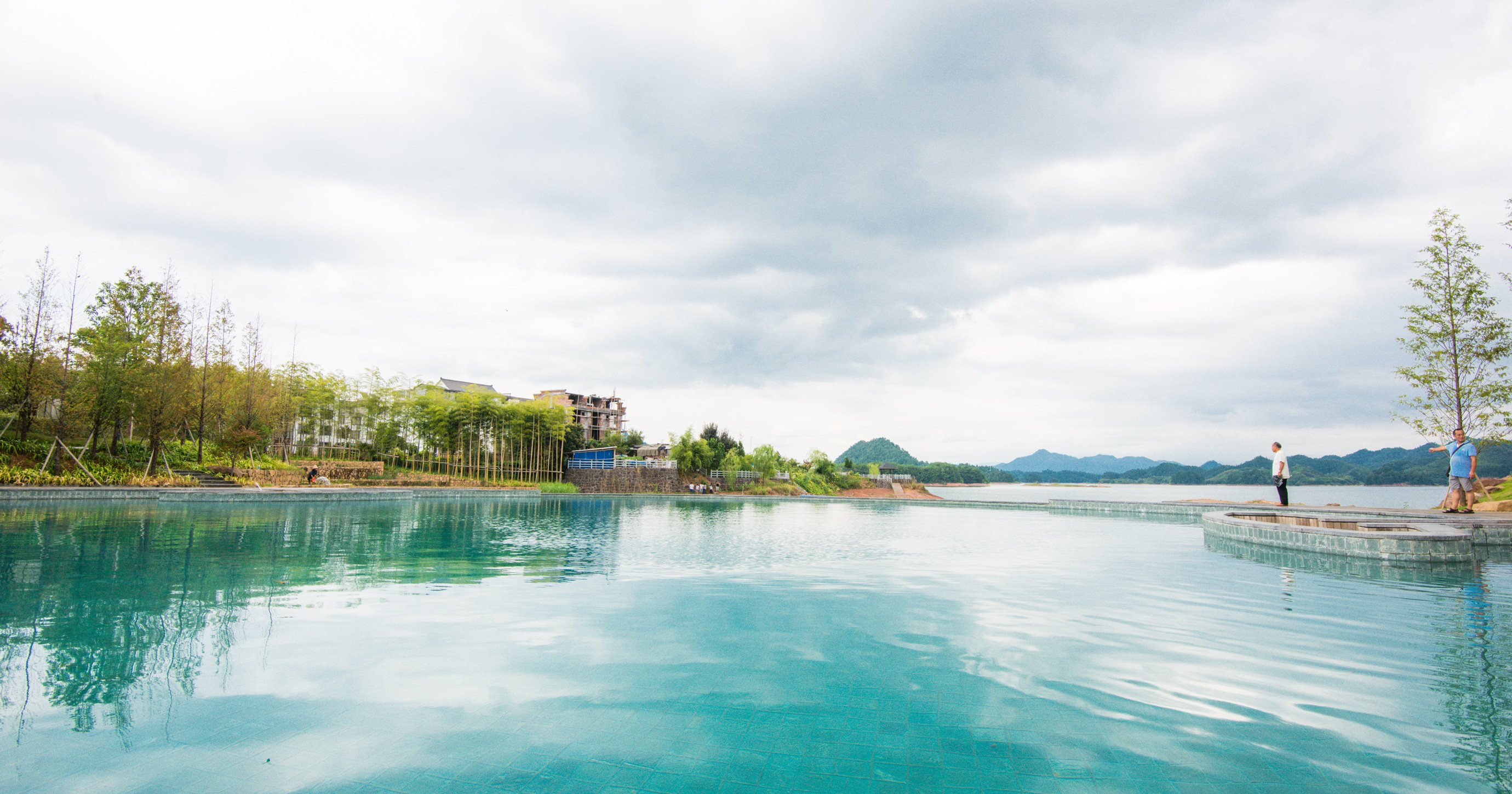 游泳池是无边际的游泳池,可以泡在水中欣赏无边无际的千岛湖湖景。