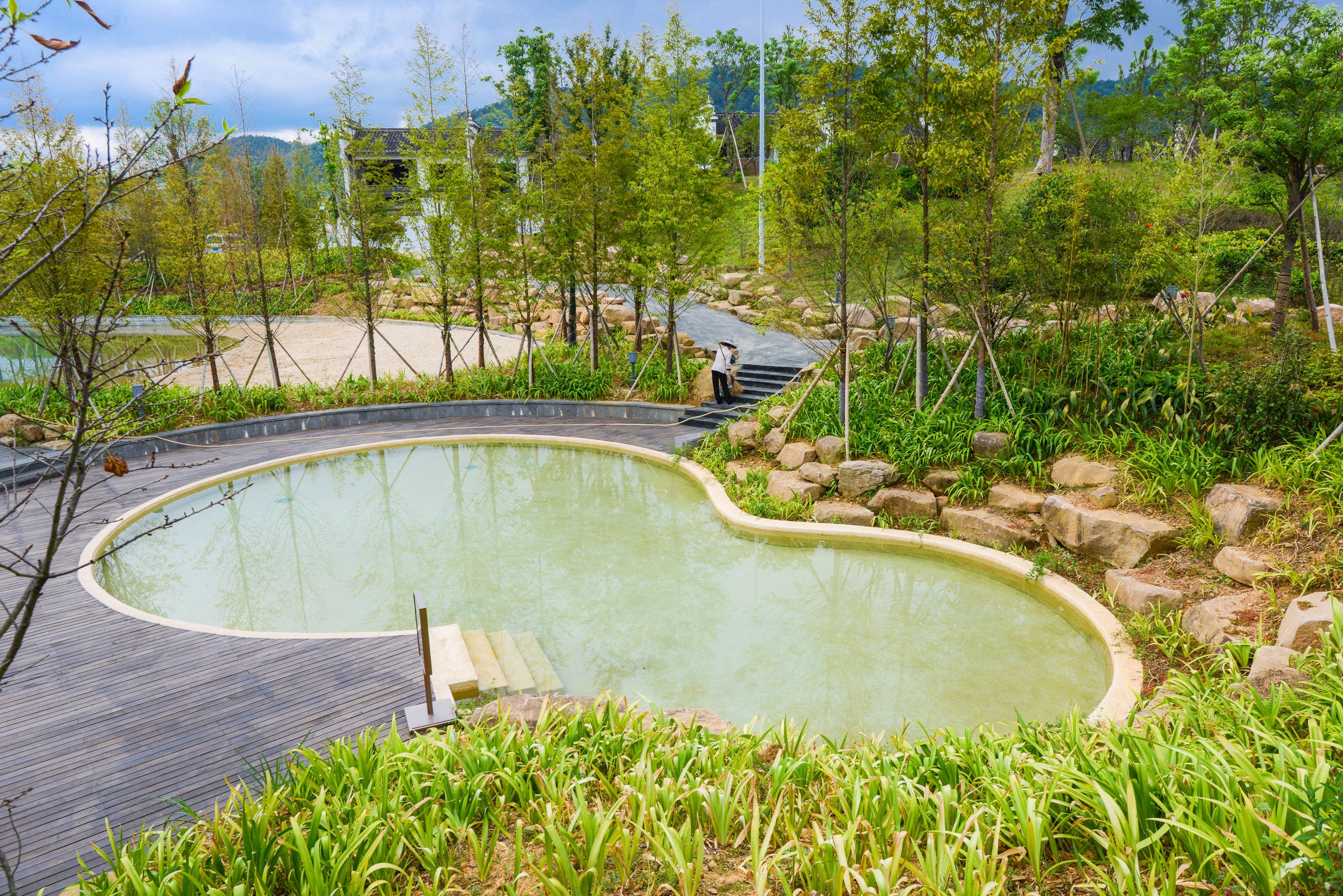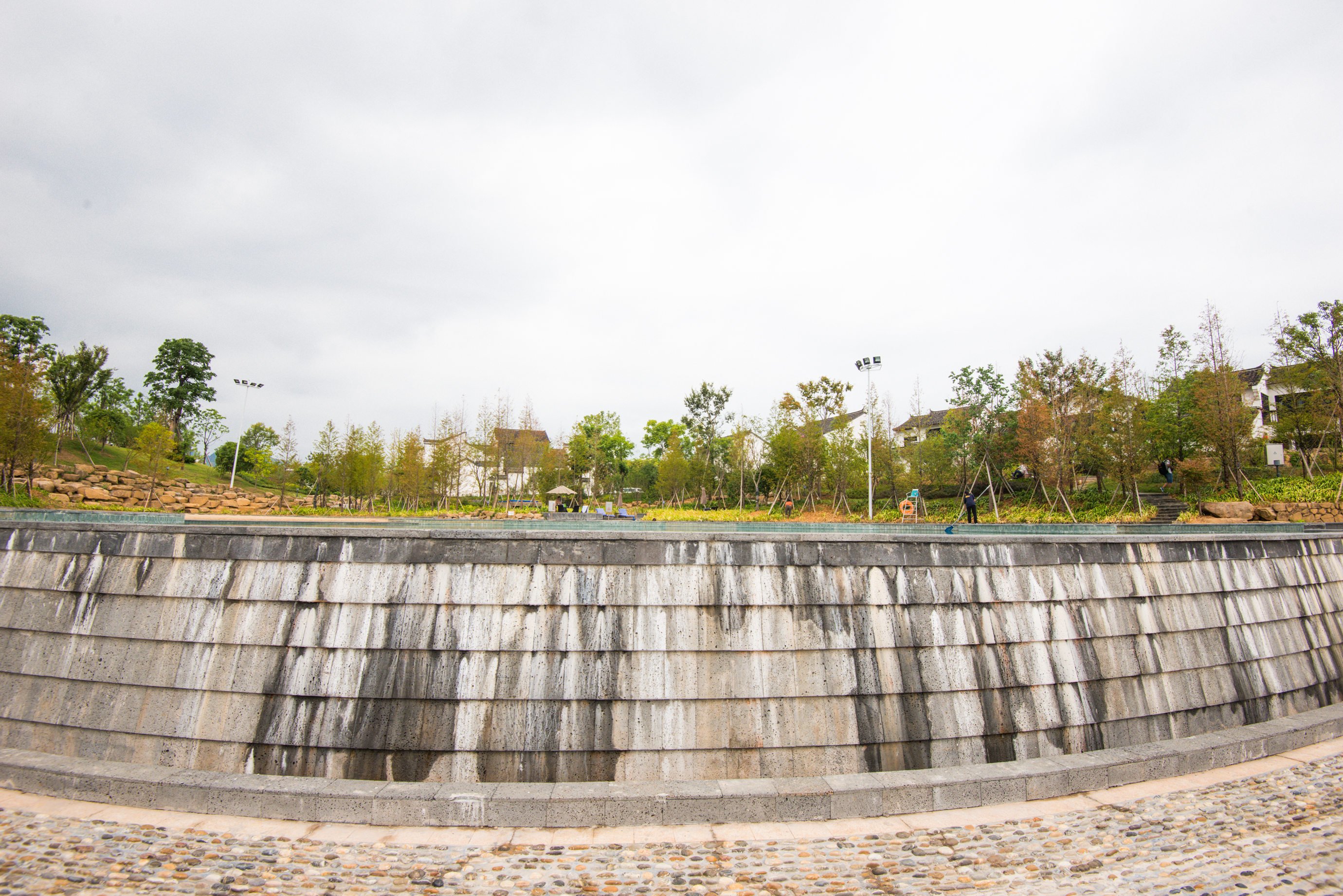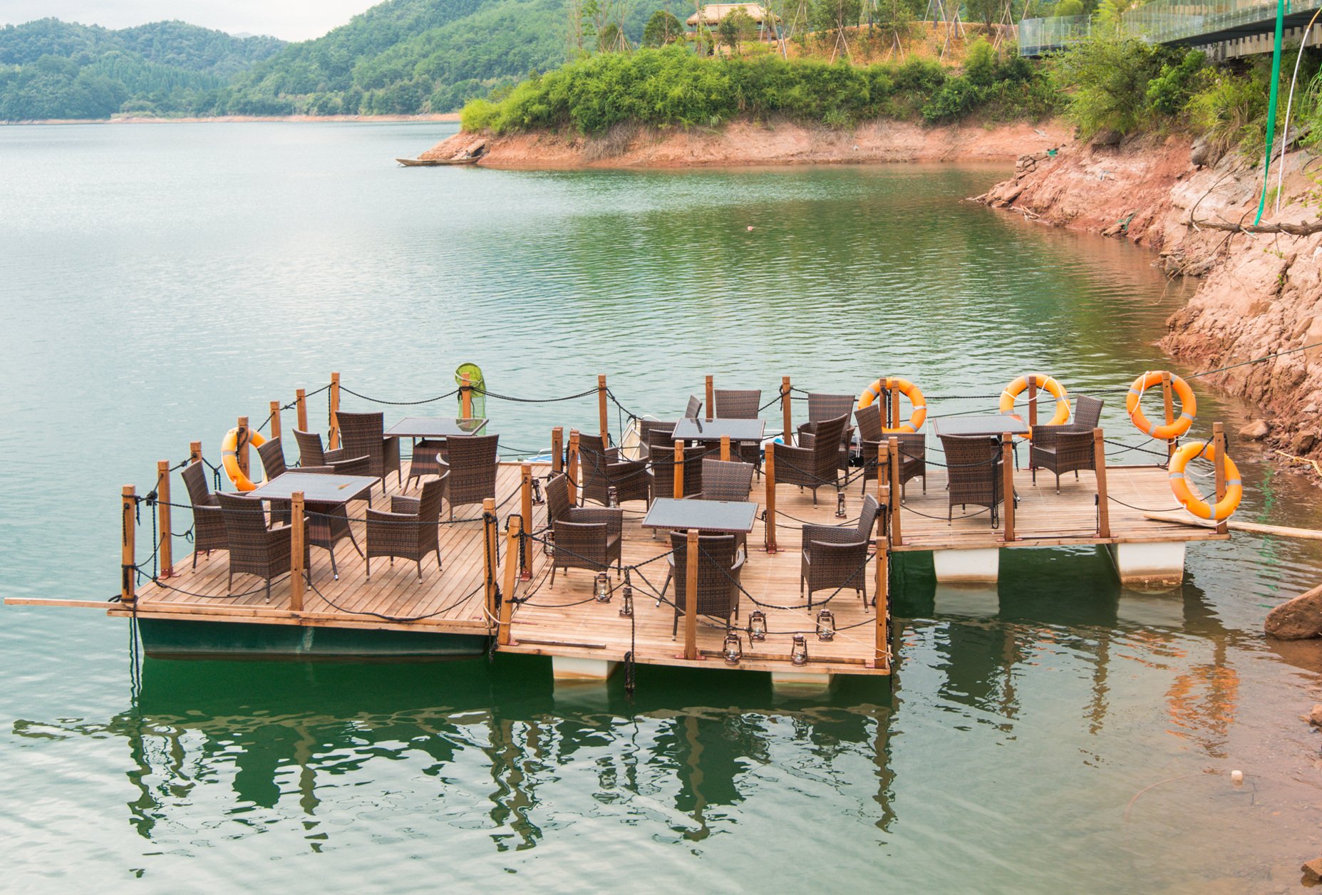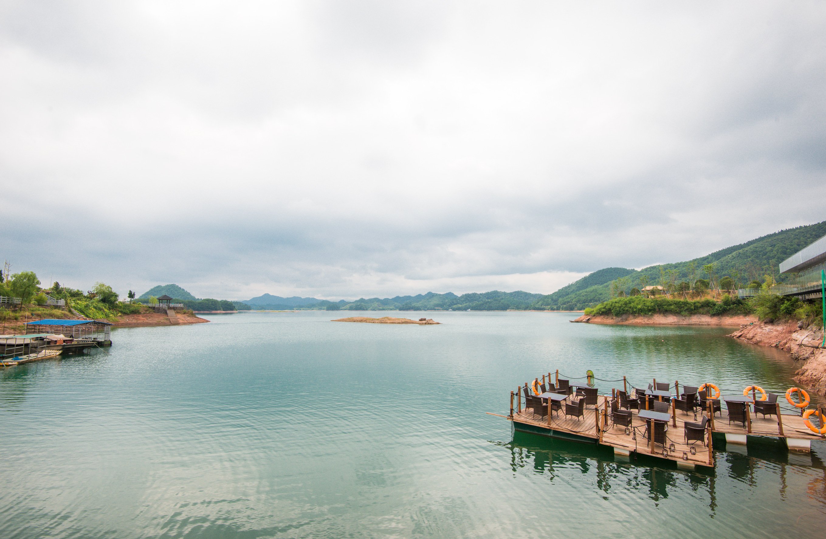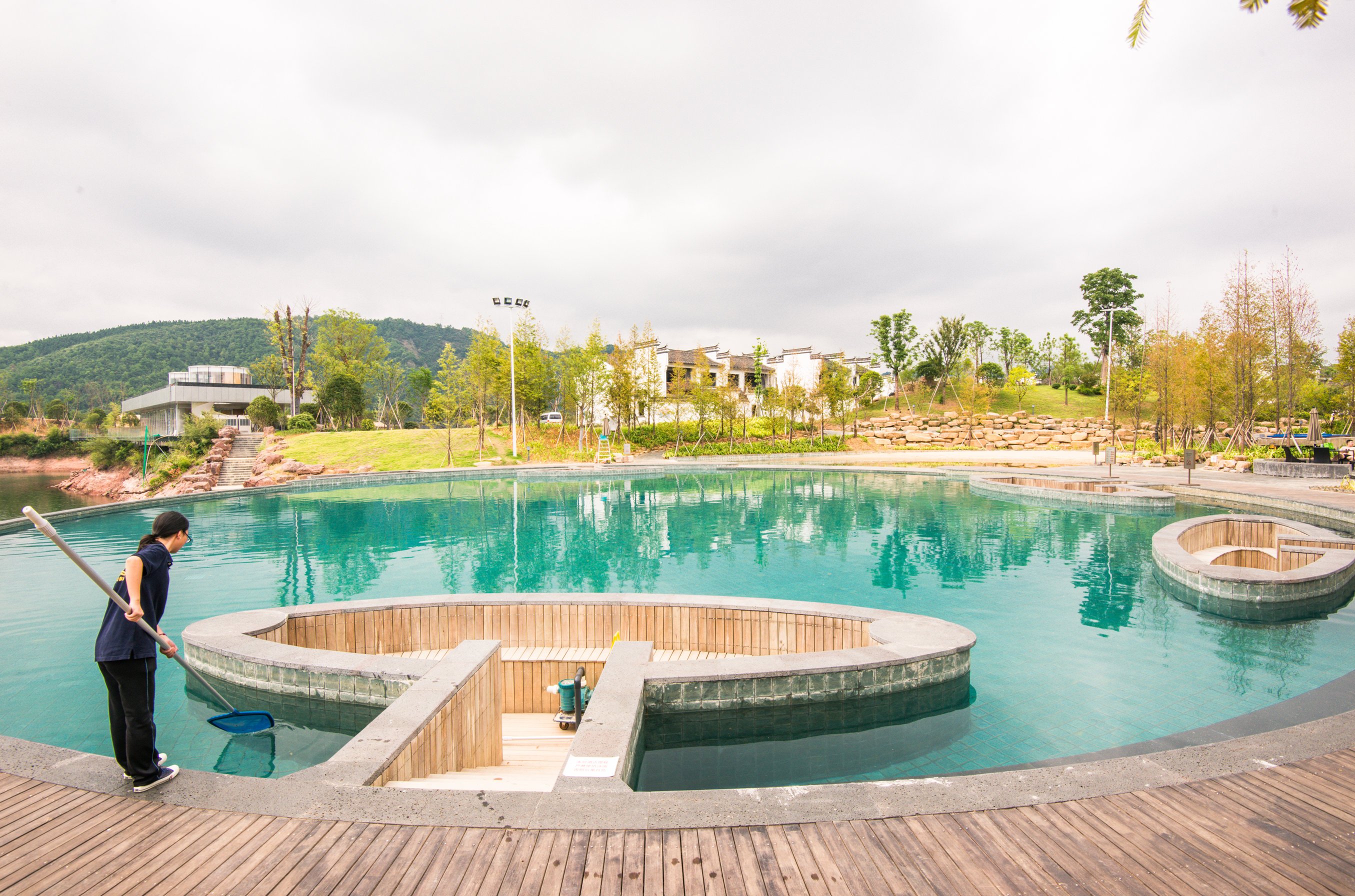 游泳池是无边际的游泳池,可以泡在水中欣赏无边无际的千岛湖湖景。