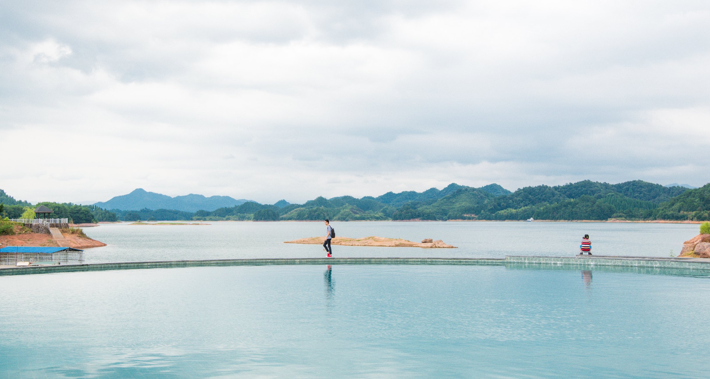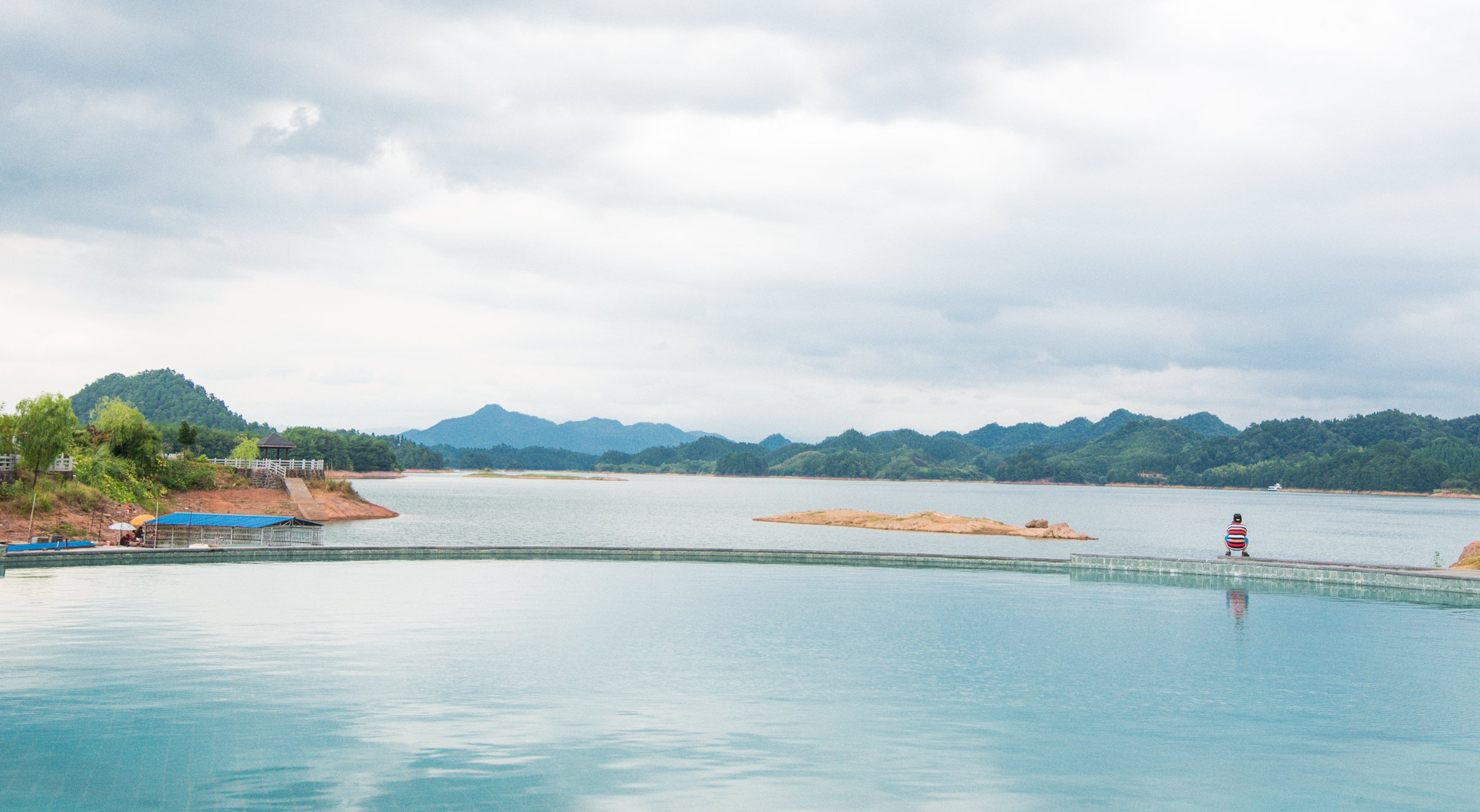一边在泳池里泡澡,一边欣赏美丽的千岛湖风景。