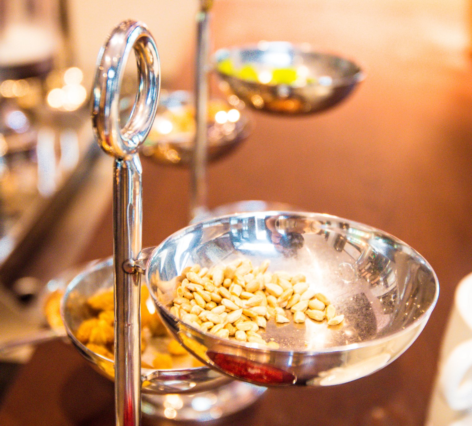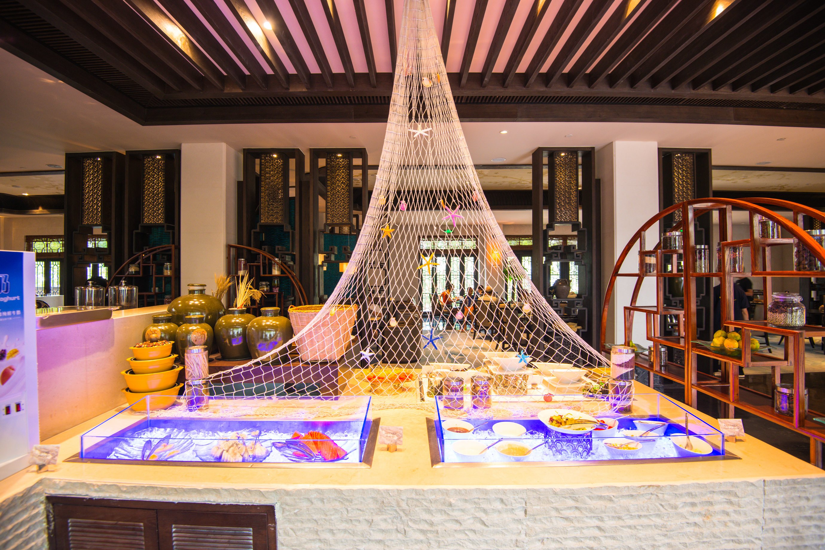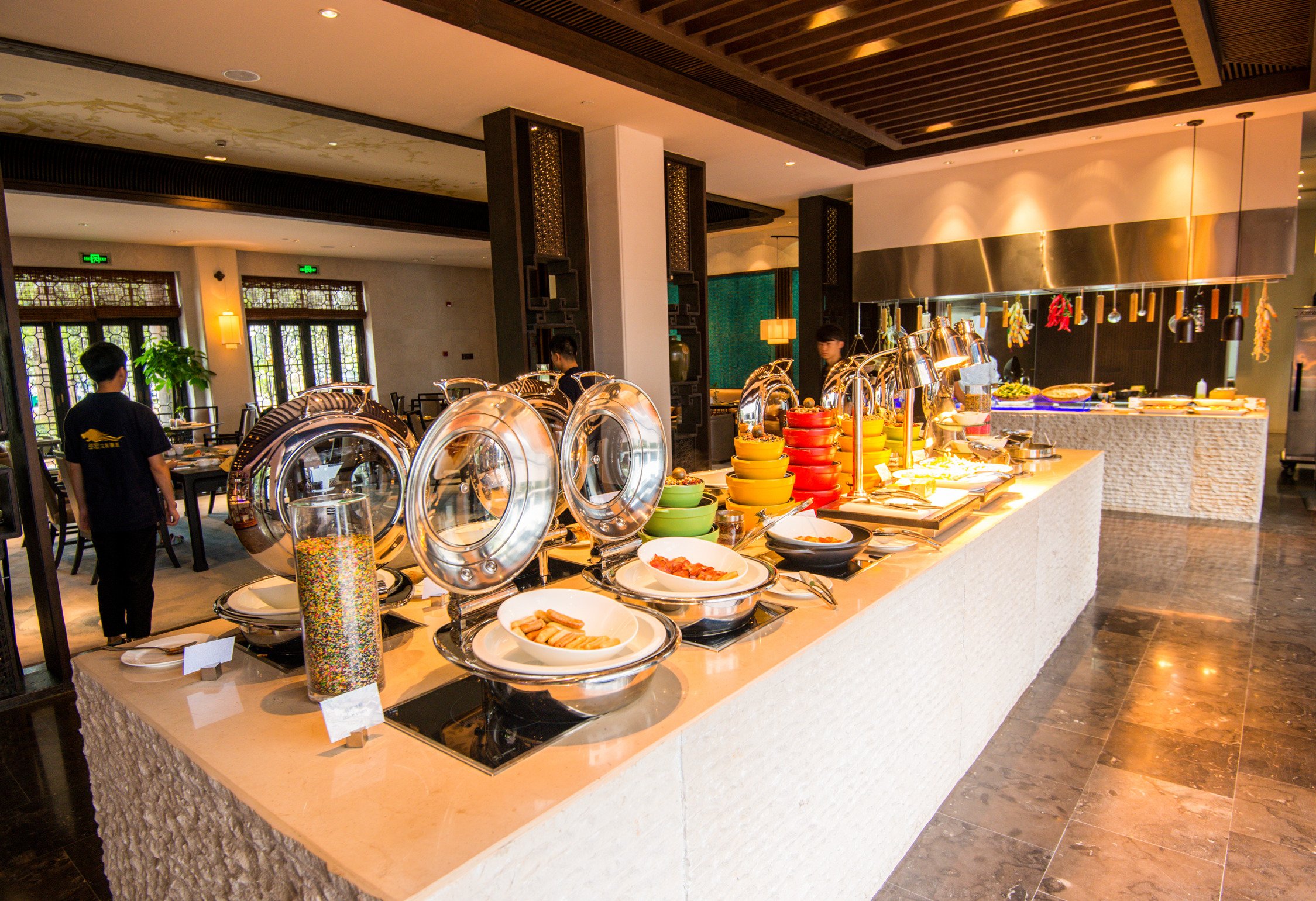 酒店的餐厅位于大堂进门的左手边,规模很大,环境优雅舒服。餐厅内部还有一座徽派水池子,里面放养着几条观赏金鱼,非常有徽州贵族人家的庭院风格。从餐厅的功能、服务、环境、食物口味来讲确实是非常具有奢华型酒店里早餐厅的档次与标准。