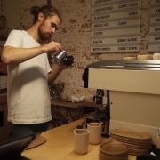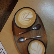 去的时候店里只有我们这两个客人了,咖啡师在收拾着准备下班,我们点完单慢慢喝着咖啡,找咖啡师聊了几句,陪他打发关店前剩下的无聊时间,也找他推荐了几个在巴塞罗那喝咖啡的好去处。咖啡师从英国来,也说喜欢巴塞的好天气,巴塞这座城市真是有一种能把人留下来的魔力啦! 店里也有贩卖一些生活类和咖啡类的杂志,加上周边设计师的画作,整个空间看起来很和谐啦。它们家用的咖啡豆来自巴塞罗那本土烘豆品牌NOMAD coffee和Threemarks coffee的豆子,出品也很赞。 一般我早上出门喝了咖啡的话,下午或者晚上带地主去咖啡馆的时候都只会点一杯小小的Cortado,然后会点Flat white,我们俩一大一小双子星。 它们家最近做奶咖用的是NOMAD的哥伦比亚豆子,奶泡打得足够细腻,入口平衡感也很强。调性没有早上在Syra喝的那一杯那么有特色,但总体仍然是一杯在附近的时候很值得去喝的咖啡呢! 坐在绿植里的感觉也很好,店里的咖啡杯我和地主都很喜欢,问咖啡师是哪里买的? 他说是在它们家楼上的那一家姐弟开的艺术工作室自己设计生产的。不规则的曲线美,看见摸到实物的时候让我很欢喜。咖啡馆这样的巧思让人对这一家店的好感度上升了许多,让我想起了现在很多国内的咖啡馆,在很多细节方面都比国外的一些咖啡馆要上心。一杯好的咖啡加上一些用心的构思和设计,让我不想离开噢!但咖啡一定要好喝才行