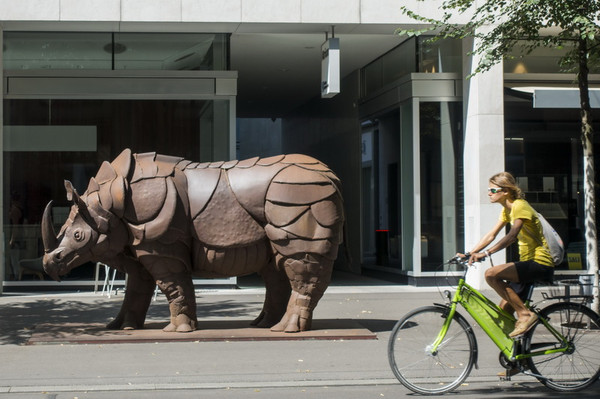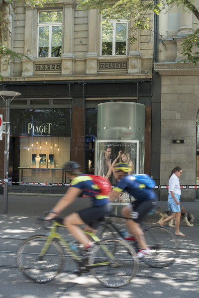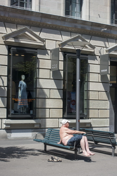 班霍夫大街(Bahnhofstrasse),周日,所有商店都不营业。平时是游客购买奢饰品的好地方。很多商店门上都有中文广告。