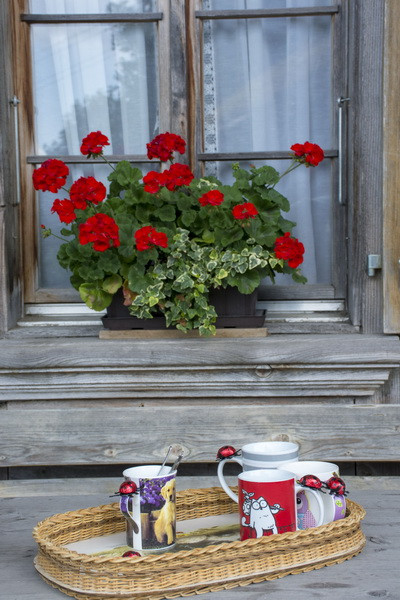 在院子里喝茶,欣赏牧场景色。杯子上都粘上了巧克力,小朋友很喜欢。