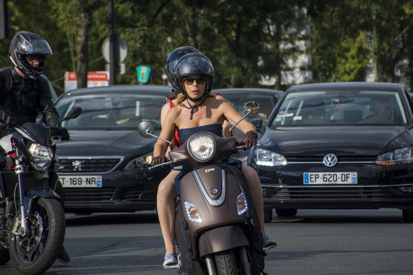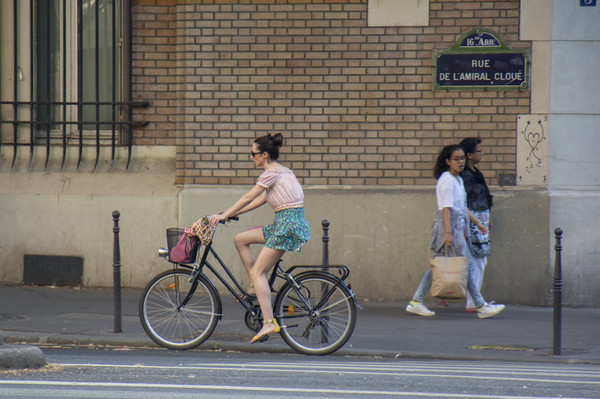 十几秒前,这位穿着很“巴黎”的女士骑车穿行在巴黎的车流当中,很像广告片。巴黎的时尚无处不在。