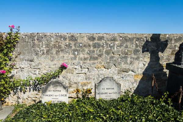 在往墓地的路上,有一个穿黑T shirt 带墨镜的壮男热情指引我们参观,热情的程度让我想起了骗子,抢劫等等恐怖景象。至少是遇见黑导游了吧?想想黑导游也不怕,大不了花小钱就能解决。心怀不安步行走过几百米无人的村道,就见到一个大墓园,墓园里有两三人在扫墓,见我们是游客,就往一个方向“遥指”梵高墓所在。我们沿着方向搜索了十几分钟,才在尽头围墙边不起眼的地方发现了伟大艺术家和他弟弟的墓地。为什么难找?太不起眼了,很多墓地都有漂亮的雕塑、高大的墓碑,鲜艳的花朵。梵高的墓地还是保持原来的平民样子,照片中鲜花和十字架都是相邻墓地的。想想画家当年穷困潦倒,死因不明,墓地原来就应该是这样吧。当地政府没有因为画家这么有名,重新风光大葬。据说墓园里面的名人不止梵高。