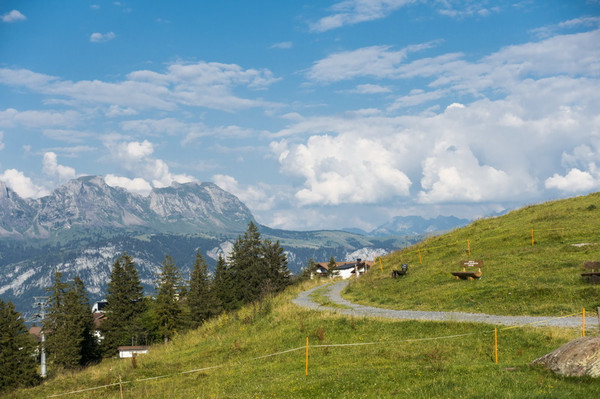 一条弯曲的弧形小道通向山上牧场,分成了徒步道和越野单车道。面群对山环绕,在这里走走,或者安静地在这里站一会或者坐一会也不错。