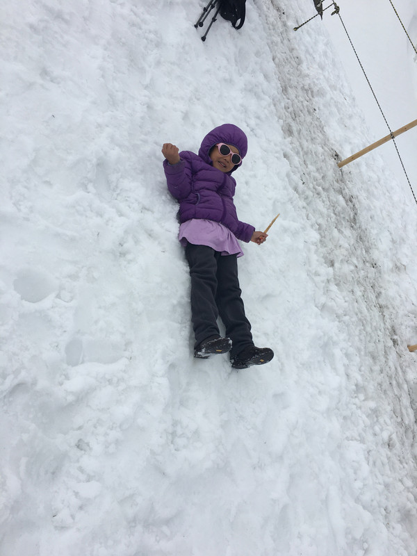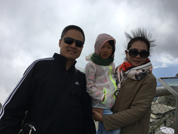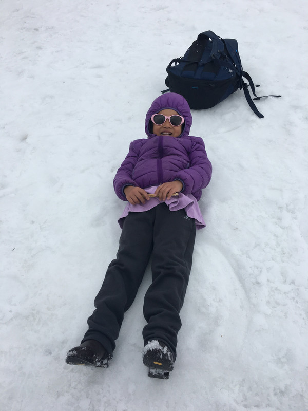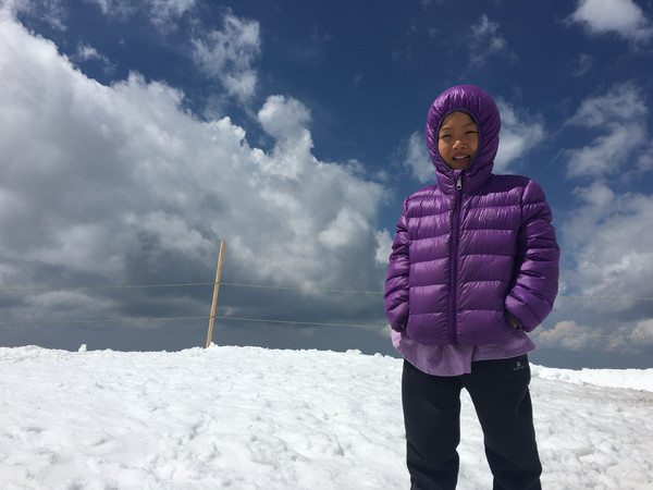 这个小朋友一到山顶就说冷,哭着不肯拍照,其实当天天气晴朗,虽然有些积雪,但其实很暖和,从我的装束就可以看出