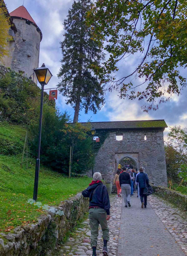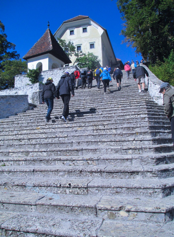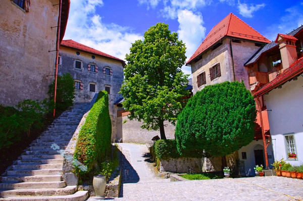由于当天有几对婚礼在湖心岛的“朝圣教堂”排队举办,我们改变行程先去参观布莱德城堡,这座由德国亨利二世皇帝出资修建的城堡,不仅是中南欧最古老建筑之一,也是斯洛文尼亚游客接待量排名前三的旅游景点,拍这么一张没有人流的堡内半景就浪费了我大半个小时。布莱德堡建筑风格略显杂乱,一眼就能看出罗马式塔楼、巴洛克城墙、巴伐利亚设计的不同之处,之所以出现这么多风格,是因为每个时期都会有不同的主人对城堡进行维护翻新,直至欧洲文艺复兴之后才完全定型。