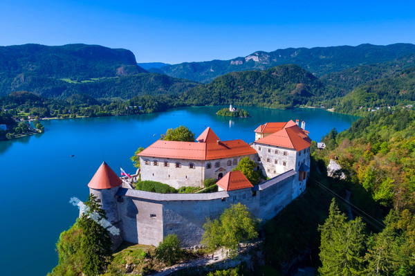 城堡内有座开放的礼拜堂,当天也是人满为患,据说有5对新人正在等待行礼。于是在观景餐厅吃了顿饭就去了背面观景台,虽然看不到布莱德湖,但置身于丛林之间的感觉也很不错。通过妮娜向城堡管理方提出无人机申请获批后,我在观景台一口气把4块电池都用完。一直到晚上夜色渐浓,才在管理方的闭园提醒下离开布莱德堡(夏9点、冬8点关闭)。