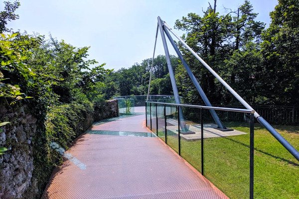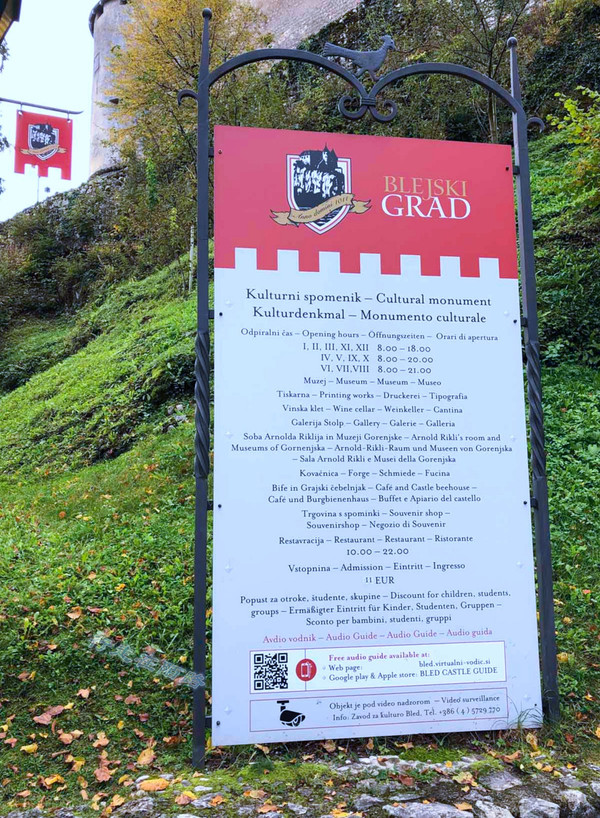 爬上台阶后有左右两条路,左边有引导牌,上面有湖心岛的部分介绍与语音导览二维码(湖心岛忘了拍,这张照片上的二维码是布莱德城堡的),扫码后有中英德等各种语言选择,跟着语音和地图边听介绍边看风景,不需要导游也不收费。