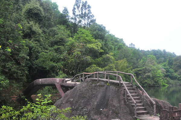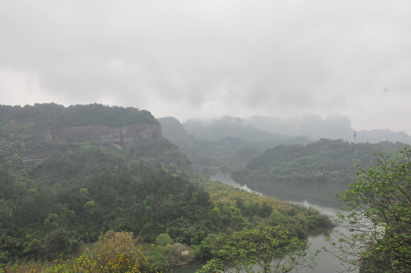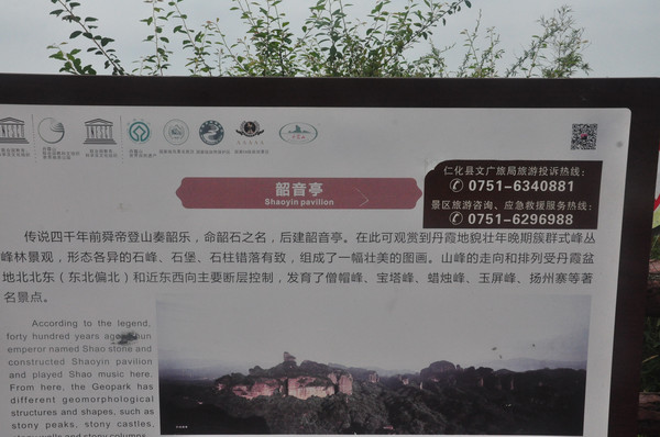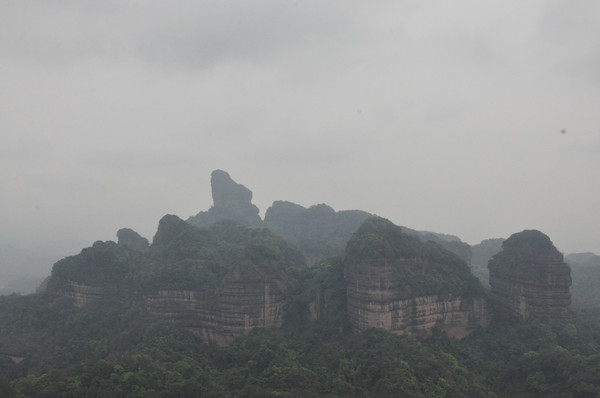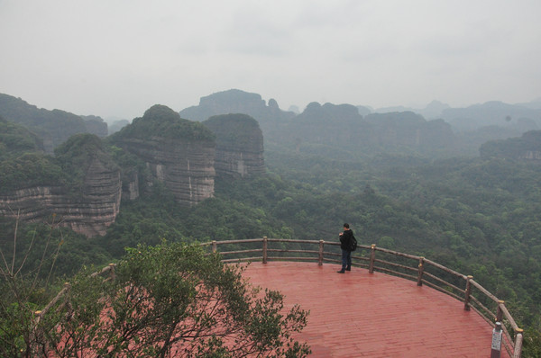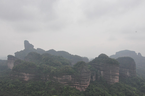 过了丹梯,到达长老峰顶,观日亭还在上面,由于阴天无法观日,我们没有马上登顶,先往舵石方向而去。没想到这一段路虽平坦,很耐走。在舵石的韶乐亭上观赏对面丹霞山生态景区的山峰全景,朦朦胧胧,云蒸霞蔚,很有意味,如果是晴天,那一定更美。
