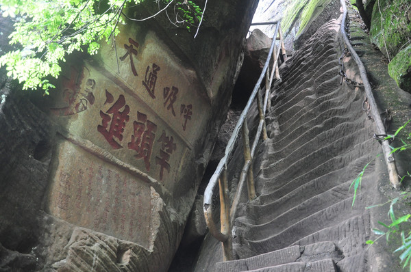 由别传寺院外一条小道往前,就是颇有名声的丹梯铁索。丹梯铁索为全山最险之处。是前山至山顶的唯一通道,原无路可登,后经人工开凿石阶,两旁辅以铁链,游客才得以上到顶峰,领略无限风光。攀登"丹梯",几乎是面壁而上,险峻无比。两旁空旷,无所依附,丹崖千丈,直落涧底,令人望而生畏,心悸目眩,实在是一种探奇历险,锻炼勇气的经历,故应步步小心,踏实而行。