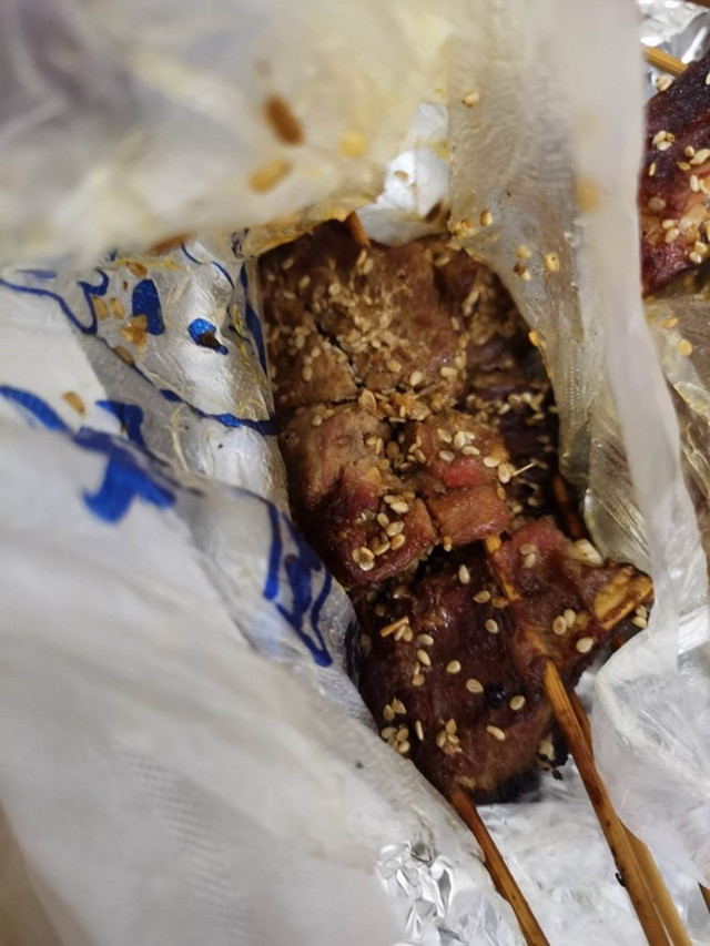落地海拉尔,我们先去提了车子,一嗨的门店就在机场里,取车很方便。办完手续之后就开车去了酒店。10月初的海拉尔已经很冷了,加上一天转机,坐飞机很累,索性就点了外卖。外面选的是羊肉,贵,但是也很好吃。这边肉串分量也很足。