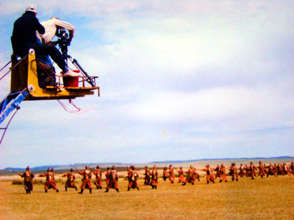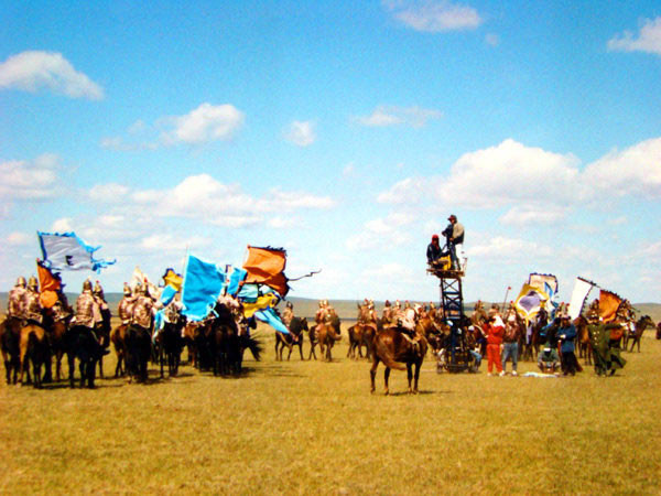 例如拍摄蒙哥出征、凯旋的重场戏时,剧组要早上六点钟出发前往距市区50公里处的军马放牧场景地。由于八九月正值军马放牧的季节,参加协拍的骑兵部队只有四五名战士在牧场放牧,其他均驻防在锡林浩特市市内。因此骑兵们比剧组还要提前两小时出发赶去套马、备鞍、换服装、穿盔甲等做好一系列准备工作。