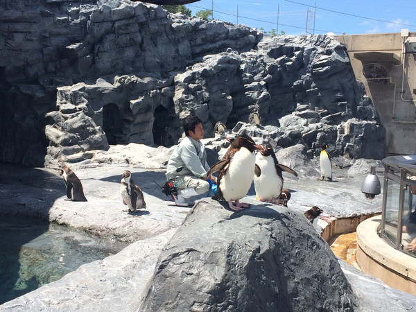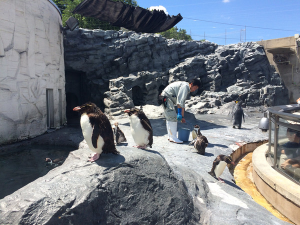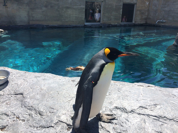我们非常幸运地看到喂食企鹅的节目。估计如果是冬天,后面衬着皑皑白雪,感觉一定更好。今天的旭川气温22度,但是太阳下依然觉得好晒。那些企鹅、北极熊呀都一定不好受吧。