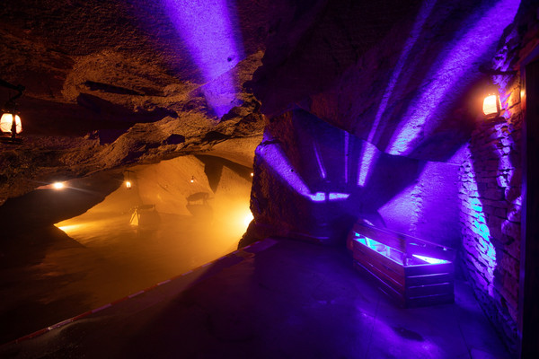 穿门而入,里面又是另一番模样,古老的洞穴经过匠人的巧夺天工,千姿百态,宛若迷宫仙境一般。洞内的温度较低,耳畔时不时传来水滴的声音,沿着石壁跌落水潭,清脆悦耳,虚拟而真实。