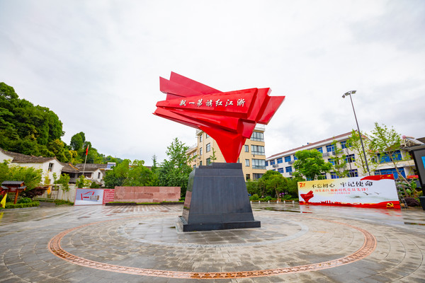 碑身的七个大字十分醒目,由张爱萍将军亲自题写,在风雨的洗礼下不改颜色。纪念碑的一侧矗立着一座红色雕塑,造型极具特色,酷似一把手枪,又像飘扬的红旗,“浙江红旗第一飘”七个大字历历在目。
