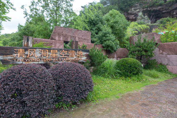 清风洞星空营地地处蛇蟠岛东南部,与海盗村相互依偎,清新雅致,让人眼前一亮。蓝天白云下,低调的招牌掩映于郁郁葱葱的绿植中,橘黄色的招牌与身后暗红色的石头相互映衬,毫无违和感,放眼望去,绿意扑面而来。