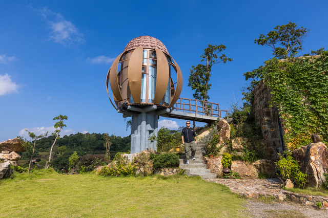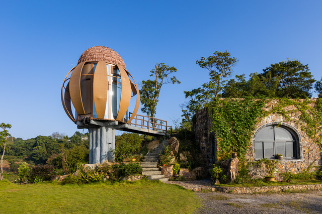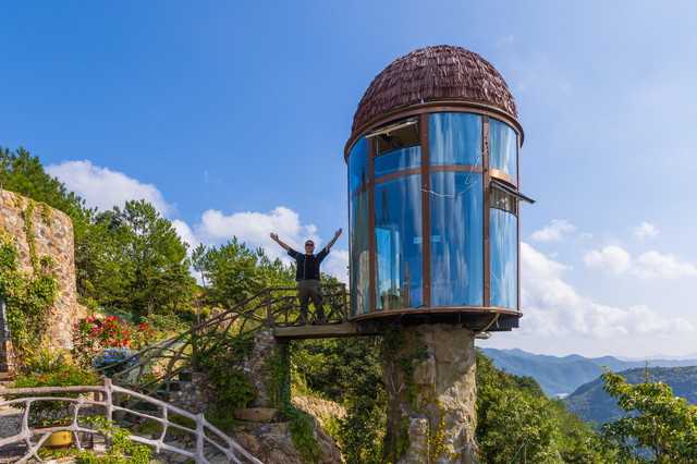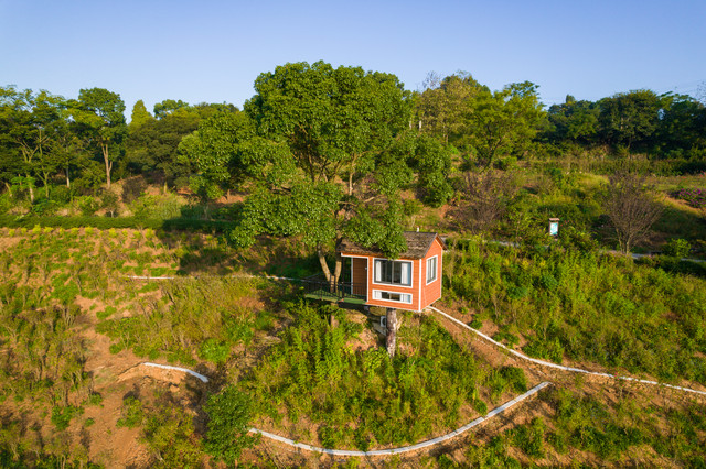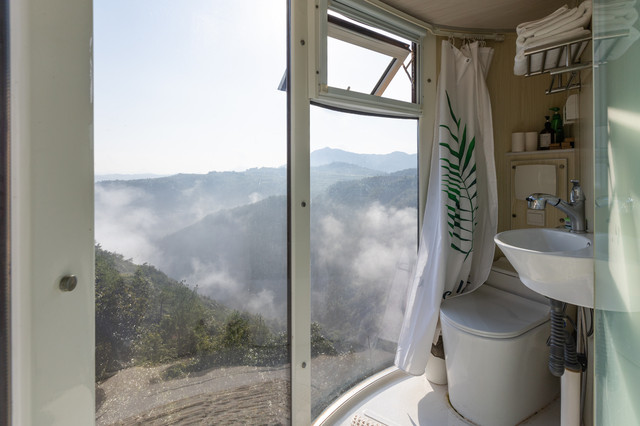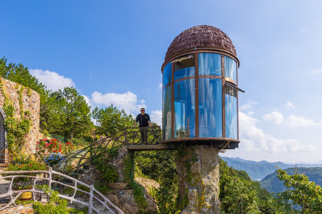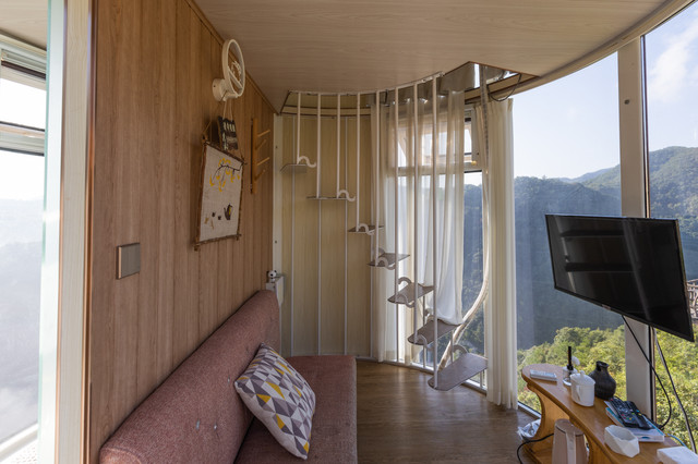 拥有360°视野的“子弹头”树屋,“生长”在悬崖峭壁上。低头可以俯瞰山谷,抬头可以看星空。房间虽然不大,但是电视机、空调、沙发、卫生间一应俱全。分为上下两层,由螺旋楼梯连接。一层是卫生间和客厅,二层是星空顶和榻榻米。