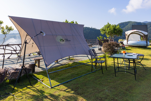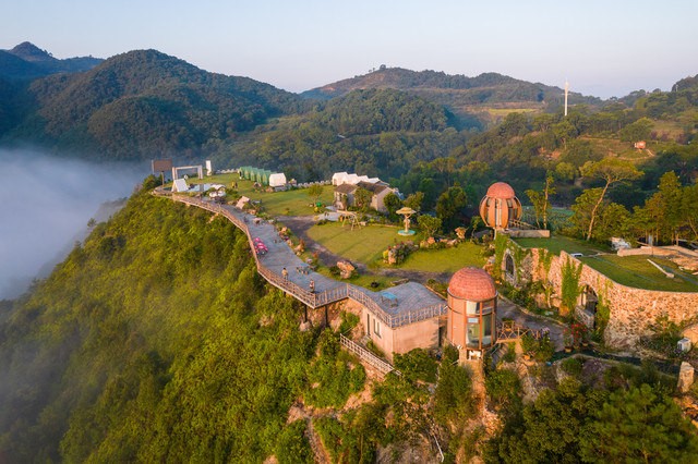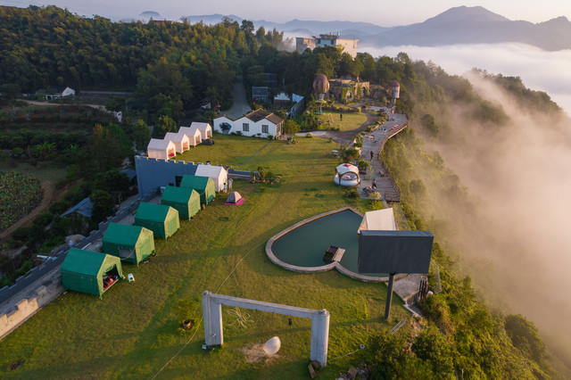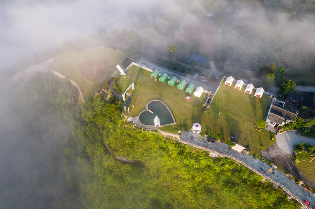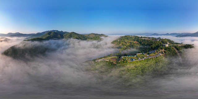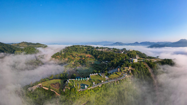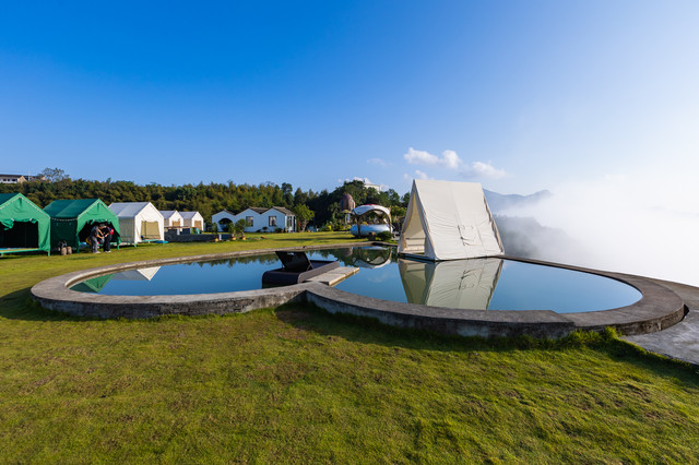 沿着蜿蜒而上的小道走进景区,第一眼便是唯美的山顶草坪。这里刚获评2021浙江省十大最具潜力露营地。你可以自己带帐篷,也可以住营地里的帐篷。夜晚,你可以仰望星空;清晨,你可以看云海日出。