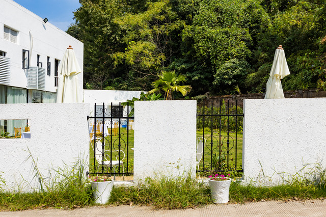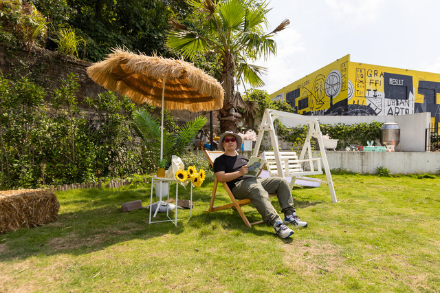 餐厅就位于创意园的入口处。整体以白色为主,院落里有一大片绿色草坪。棕榈树、躺椅、遮阳伞、秋千,还有随处可见的绿植和盆栽,整体氛围非常梦幻、非常舒适。