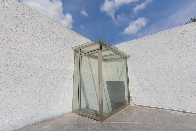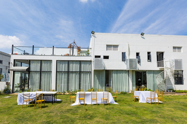 从户外草坪的白色旋转楼梯,登上餐厅的二楼。这里有一个大包厢,可以用餐、开会、团建等。穿过炫酷的走廊,外面是一个大露台,可以看到楼下整个草坪。