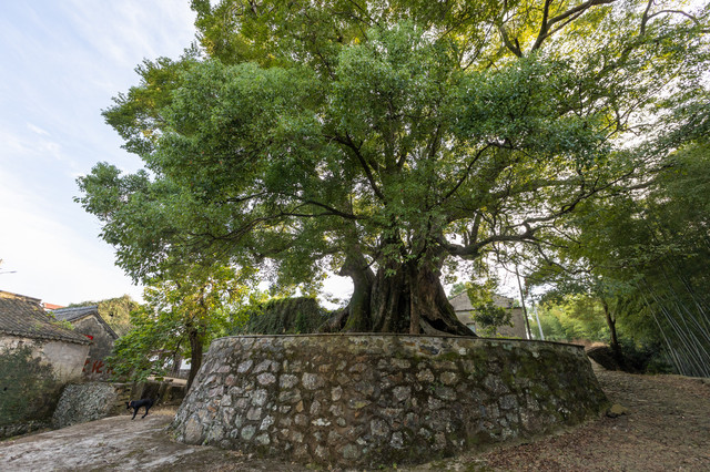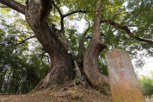 千年神樟,指的是村里的那一棵1000多年树龄的古樟树。这棵历经沧海桑田的古樟树,现如今依旧枝繁叶茂。令人称奇的是,这棵古樟树枝分两叉,中间环抱着两棵树龄超过200年的朴树和糙叶树。当地老百姓们都视这棵古樟树为神樟树,誉之为“浙江第一樟”。