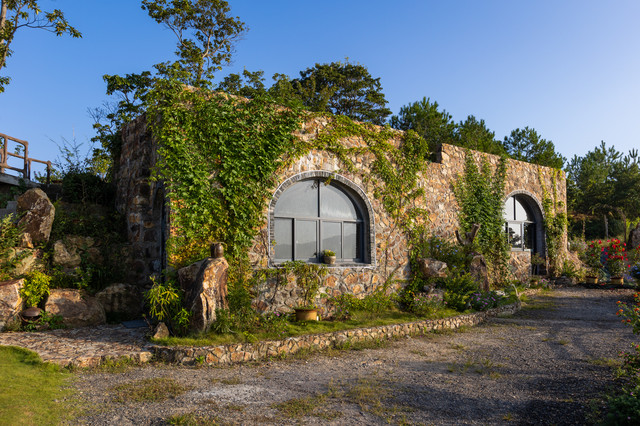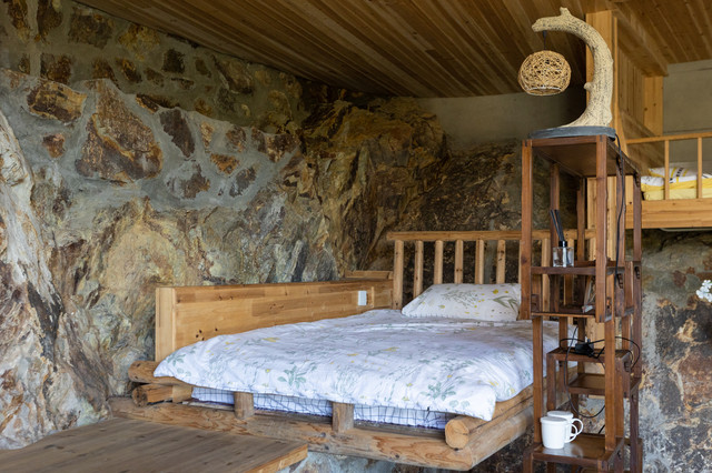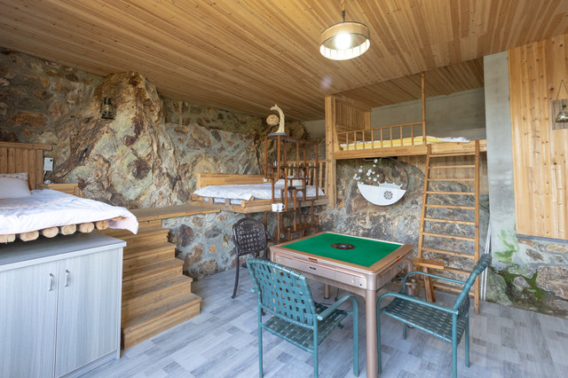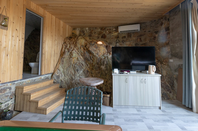 与树屋一样,窑洞房同样富有特色。从外形看,像是一座由石头堆砌而成的石屋。而内部,别有洞天。除了有电视机、空调、卫生间,还有麻将桌、藤椅、书柜等。最让人惊喜的是,许多墙面居然是山体的天然岩石。
