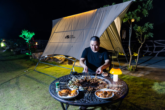 星空下的夜晚,还可以在帐篷旁来一顿海鲜烧烤。你可以自己带食材,也可以提前叫景区工作人员准备好食材。青蟹、牡蛎、蛏子、鲜虾等三门小海鲜,搭配花生米、水果、自酿果酒。大家围着炭火烤炉,一边品尝自己亲手烤出来的食物,一边谈笑风生,感受生活的无限美好。