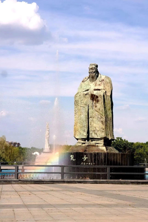罗丹广场的东侧是友谊广场,广场中央的音乐喷泉中矗立着孔子的雕塑,隔着园中的小湖(摩尔湖)可以远眺公园主题雕塑。