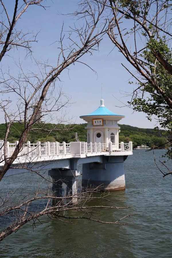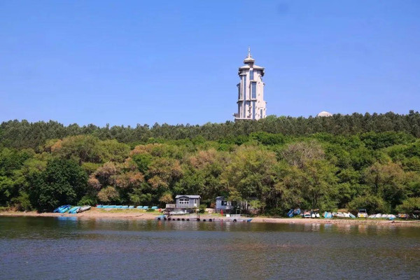 沿着森林木栈道向东,可看到一座高高的塔楼矗立在林海之中,这是碧松净月塔楼——净月潭的标志性建筑。塔楼坐落于观潭山上,像一名忠诚的卫士,保卫着这片净土。