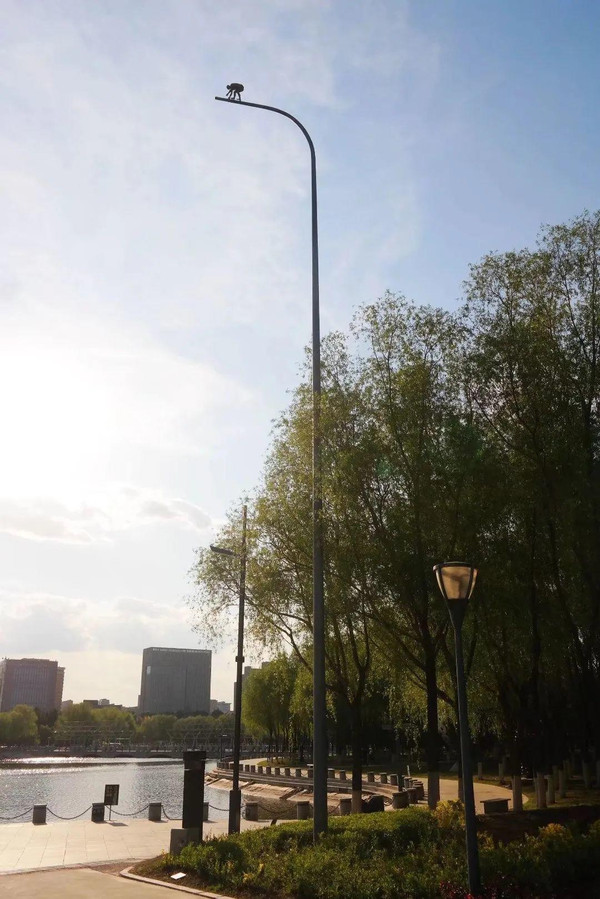 再比如下面这件,名叫《跨越》(作者:杨建平 中国),我从下面走过去时还以为是电线杆,看到了地上的名牌,环顾四周,半天没发现雕塑,最后抬头一看,才看见这件奇特的作品,比电线杆可高出了不少。