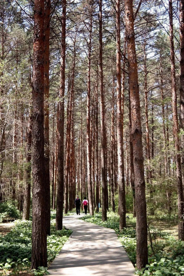 塔楼的潭对面是净月潭核心景区——森林浴场。这里种植了四万平万米的樟子松林,最高可达30米。树木伟岸笔挺,万物谧静清新,在冰片石铺成的小路上悠悠漫步,是一件非常享受的事情。