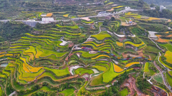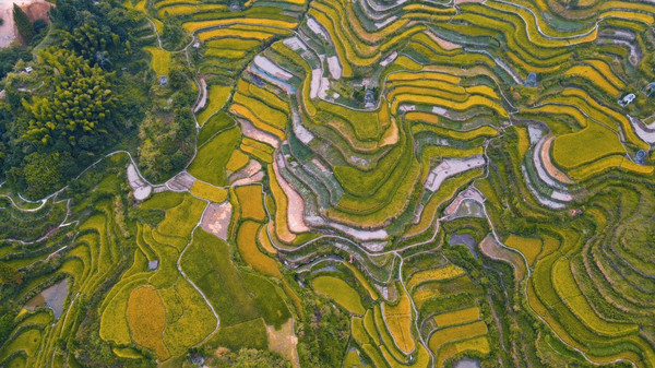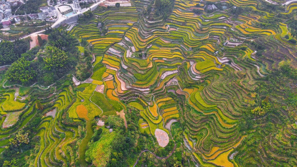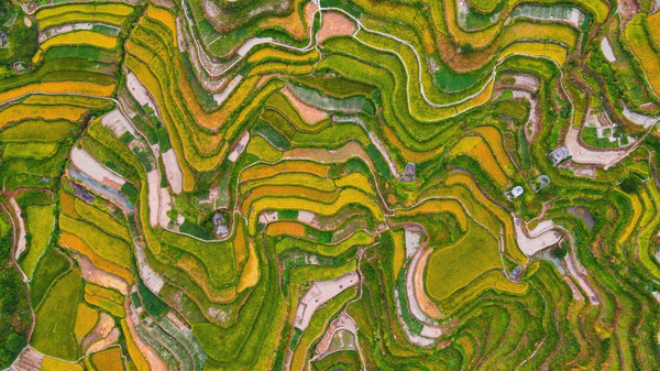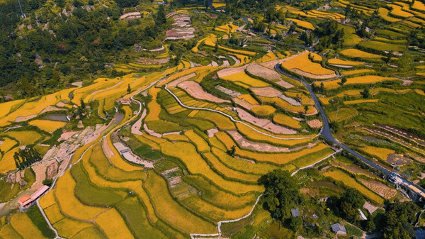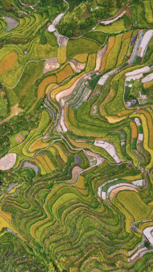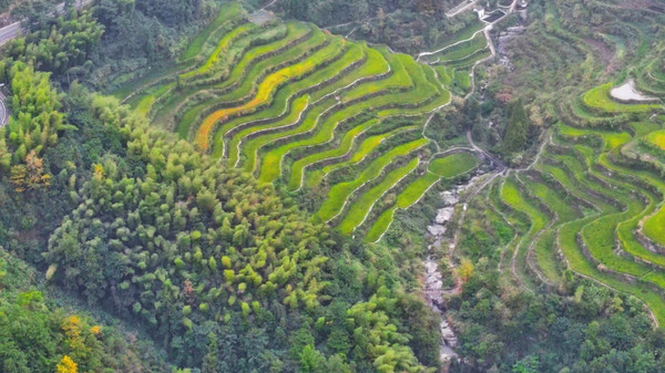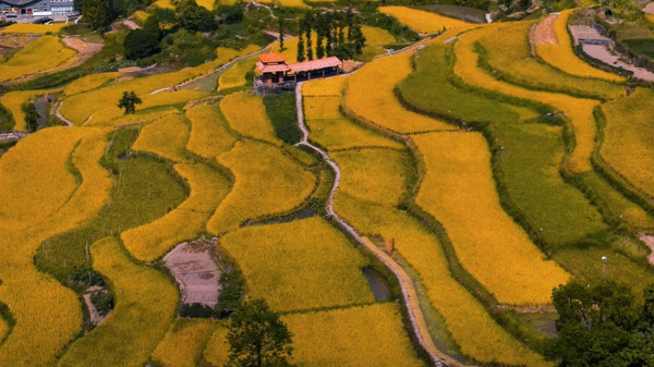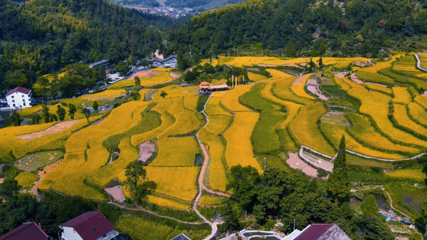风吹着稻田,空气中满是丰收的味道,这里地势由高到低呈明显梯带形状,集壮美和秀美于一体,梯田密集,形态原始,阡陌纵横,线条流畅,山高水长,充分展示出梯田的自然美。景色随季节变化而变化,不同季节有着不同的色彩,使小 舟山 梯田更加婀娜多姿。